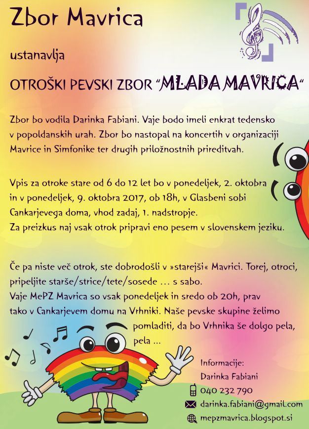 Zbor Mavrica ustanavlja Otroški pevski zbor Mlada Mavrica. Zbor bo vodila Darinka Fabiani. Vpis za otroke med 6 in 12 let bo danes ob 18. uri v Glasbeni sobi Cankarjevega doma (vhod zadaj, 1. nadsrtropje). Za več podrobnosti si oglejte priloženo grafiko. (gt)