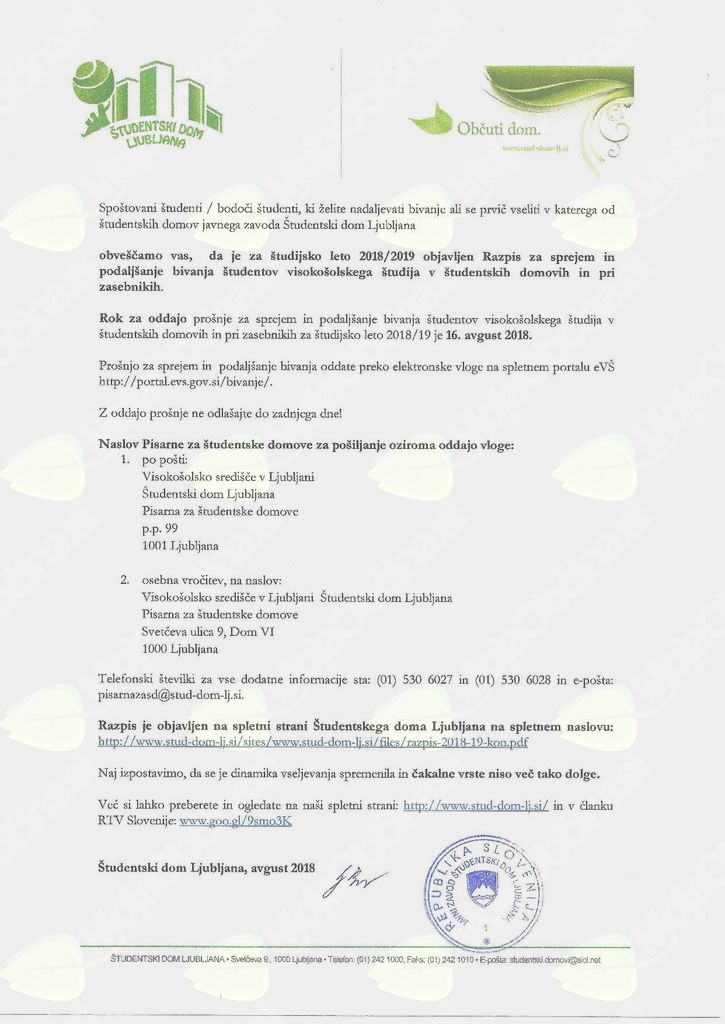 Bodoči študenti, ki želite nadalevati bivanje ali se prvič vseliti v katerega od študentskih domov javnega zavoda Študentski dom Ljubljana, obveščamo da je za študijsko leto 2018/2019 objavljen Razpis za sprejem in podaljšanje bivanja visokošolskega študija v študentskih domovih in pri zasebnikih. Rok za oddajo prošnje za sprejem in podaljšanje bivanja študentov visokošolskega študija v študenstkih domovih in pri zaesbnikih za študijsko leto 2018/19 je 16. avgust 2018.