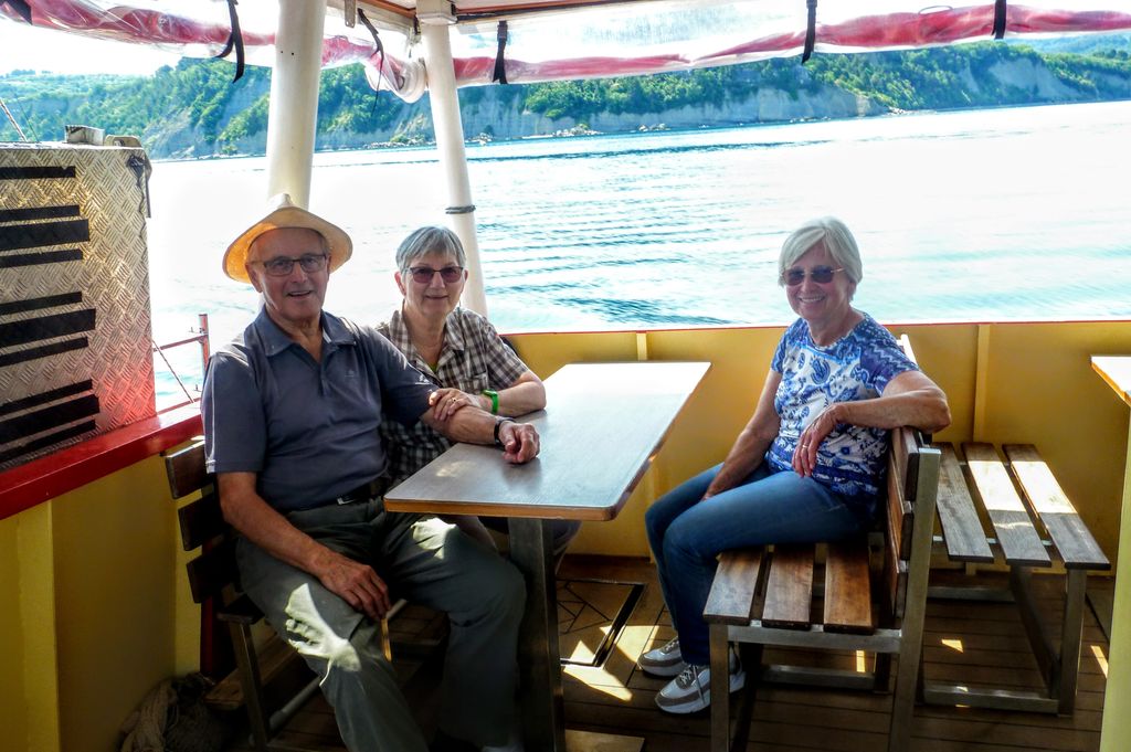 V Izoli smo se vkrcali na barko za triurno plovbo. Pluli smo pod strunjanskimi klifi do Portoroža in uživali ob druženju, plovbi, dobri ribi in pijači.