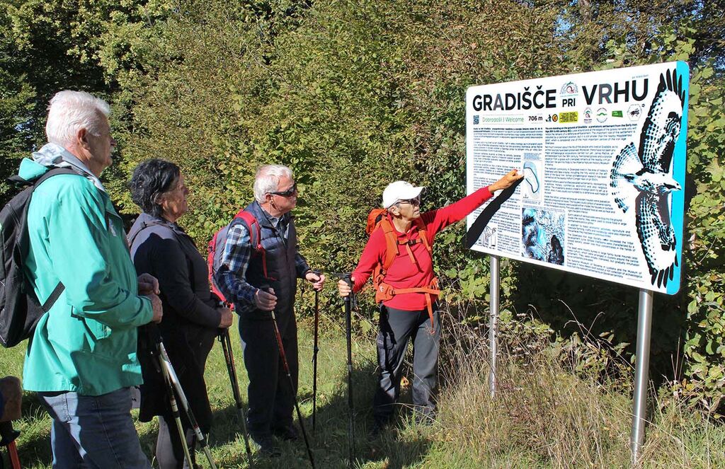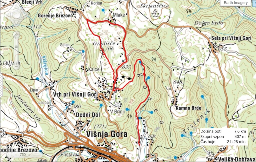 Kolovozna pot nas je stran od slapu vodila levo navzgor. Tik pred naseljem Vrh nad Višnjo goro so najbolj pozorni ugledali osamelo dežnikarico – marelo. Pustili smo jo, da do konca razpre svoj dežnik in nameni srečo kakemu gobarju. Od tu dalje smo prek dela naselja Vrh nad Višnjo Goro krenili proti Gradišču. Kot že ime pove, se je tu v prazgodovini, v starejši železni dobi (8. do 4. stoletje) nahajalo naselje - gradišče z obzidjem, katerega del je še mogoče zaznati. Opaziti je tudi jarek, ki na enem delu obdaja vrh. Gradišče s 706 m je prekrasen razglednik, ki je vabil k razgledom po dolenjski pokrajini. Tudi na še megleno Ljubljansko kotlino.
