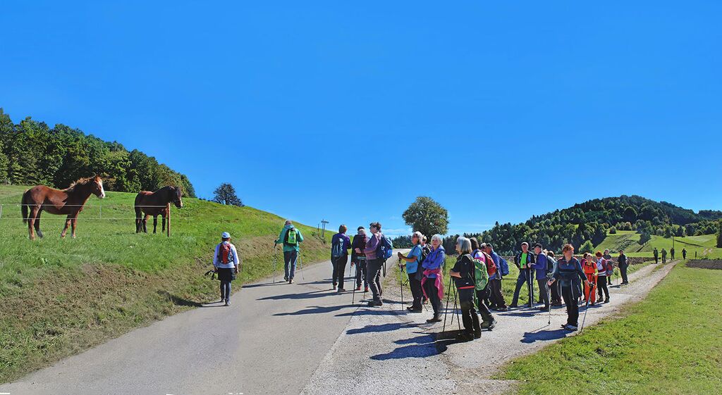 Privoščili smo si malo počitka in malico, nato pa krenili proti Leskovški planoti. Ves čas so nas spremljala obdelana polja, številni travniki in ograjeni pašniki. Na marsikaterem od njih so se še pasli konji. Kmetija Kavbojska dežela Čož s svojo pojavnostjo upravičuje ime, ki ga nosi. Ker pa so ob torkih zaprti, nismo bili deležni nobenih »kavbojskih izkušenj«. Po cestah smo obkrožili vrh Gradišče in pohod zaključili v vasi Vrh nad Višnjo Goro in tako sklenili krog.