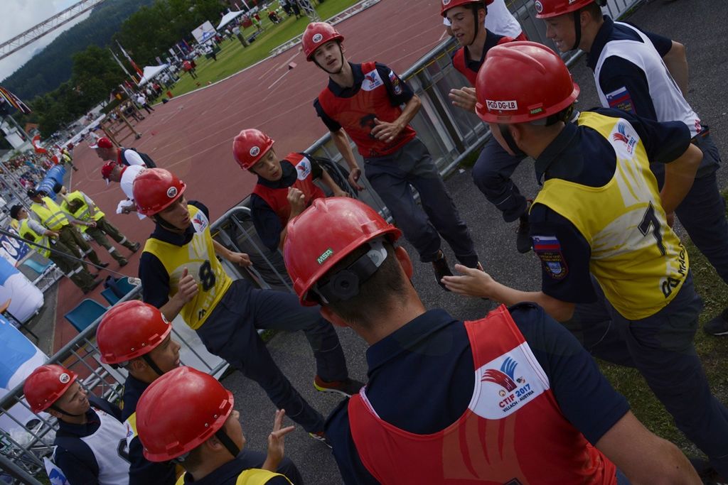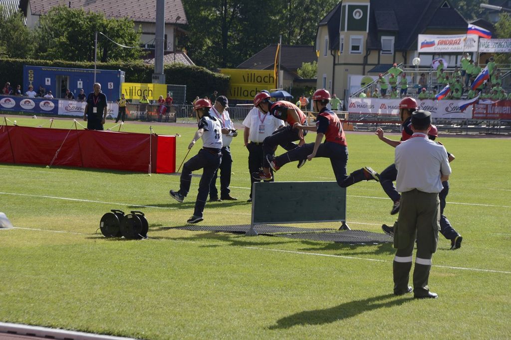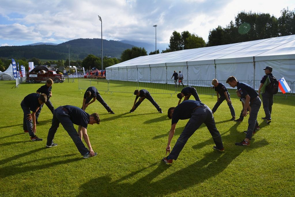 V zgodnjih dopoldanskih urah sta obe ekipi uspešno zaključili z izvedbo vaje z ovirami in štafeto z ovirami, sedaj pa je čas za stiskanje pesti, da v mednarodni konkurenci, ki prihaja za njimi, ohranijo dobre rezultate. Vzdušje v taboru je bilo v dopoldanskem času zelo dobro, fantj ein dekleta so bila zelo motivirana. Obe ekipi sta imeli bučno slovensko podporo s tribun, saj je na prizorišče odpotovalo bodisi organizirano bodisi samotostojno tudi veliko domačih navijačev. Čestitali so jim tudi "sosedje" - ekipa iz Žažarja (člani A), ki pa se bodo za odličja potegovali jutri zgodaj popoldne.