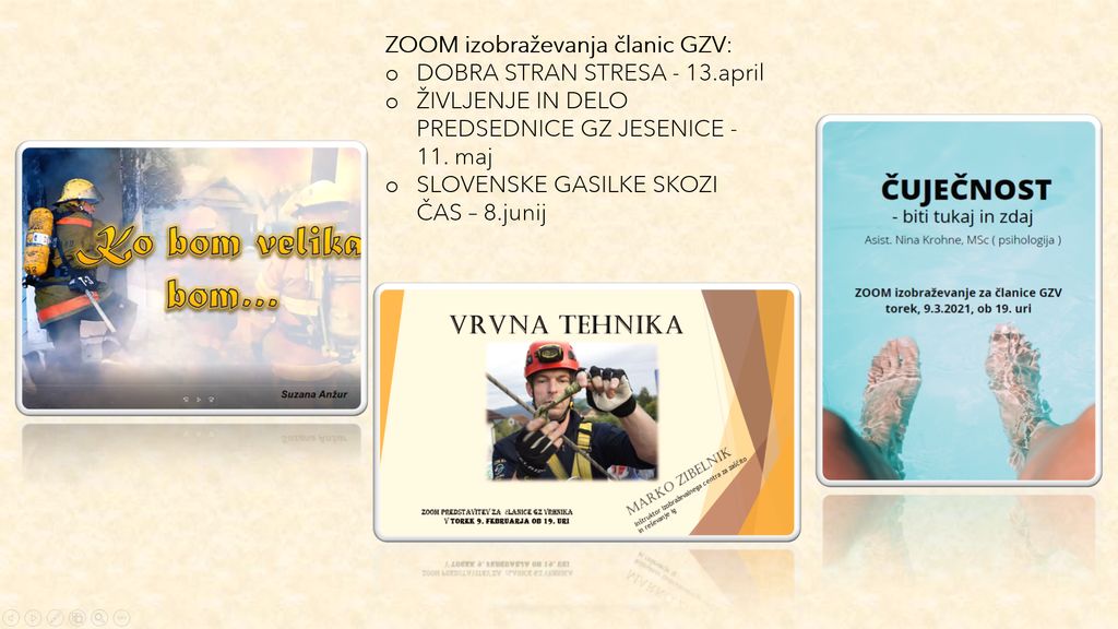 In tako smo v januarju začele z ZOOM izobraževanjem. Tri tovrstna srečanja smo že izpeljale. V januarju smo spoznale edino poklicno gasilko v Sloveniji, ki tudi opravlja svoj poklic. Suzana Anžur nam je predstavila svoje življenje in delo v Gasilski brigadi Ljubljana. Kot edina ženska v moški ekipi pravi, da se med fanti odlično znajde. Pri tem upošteva dejstvo, da se s primernim odnosom in medsebojnim spoštovanjem lahko uredi vse. V februarju smo se seznanile z osnovami vrvne tehnike. Marko Zibelnik, inštruktor gasilske šole na Igu ( URSZR ) nam je približal pomen dobre priprave, primerne opreme in znanja pri opravljanju del s pomočjo vrvne tehnike. Povedal nam je ravno toliko, da je v nas vzbudil željo po bolj podrobnem učenju te metode. Srečanje v marcu je bilo namenjeno ženski duši. Časi v katerih živimo nas usmerjajo k temu, da si vzamemo čas zase in svoje občutke. Da uredimo misli in odkrijemo kdo pravzaprav smo. Predstavitev je vodila asist. Nina Krohne, MSc ( psihologija ).