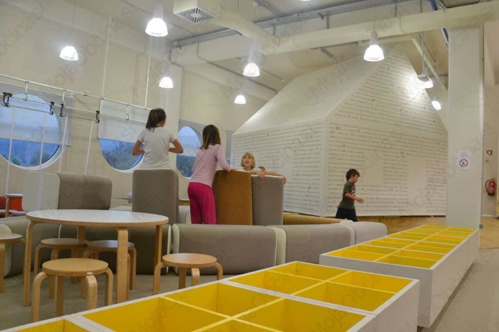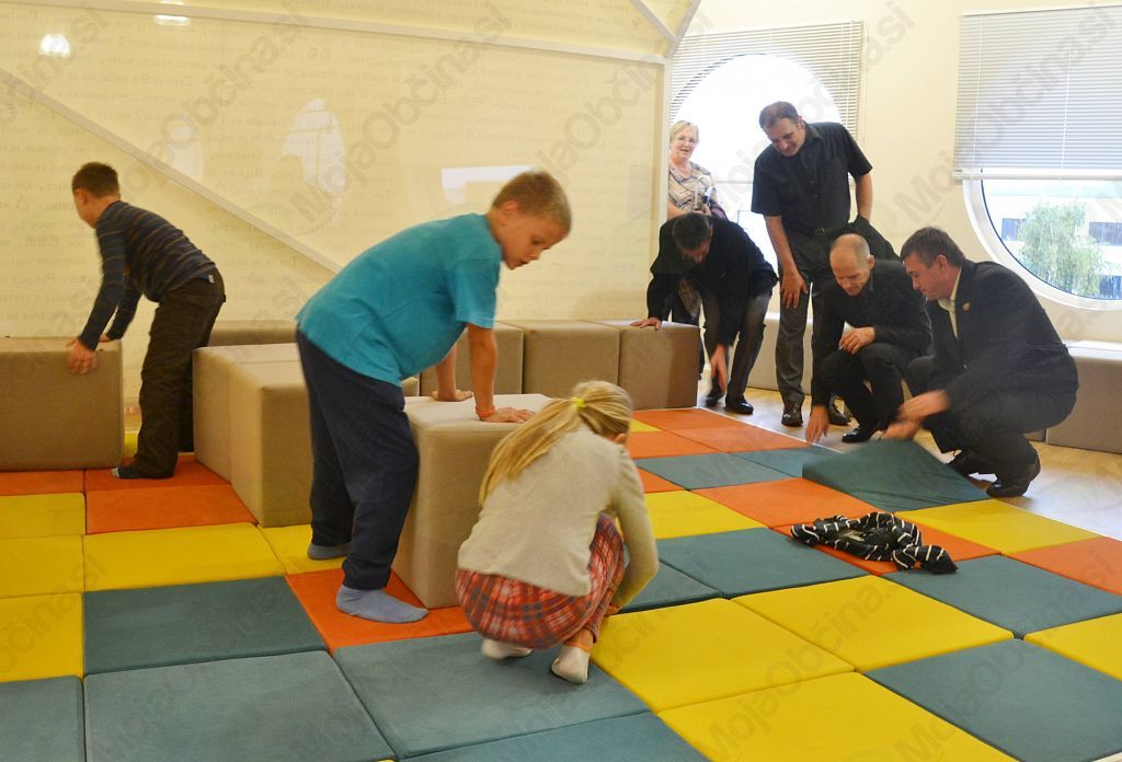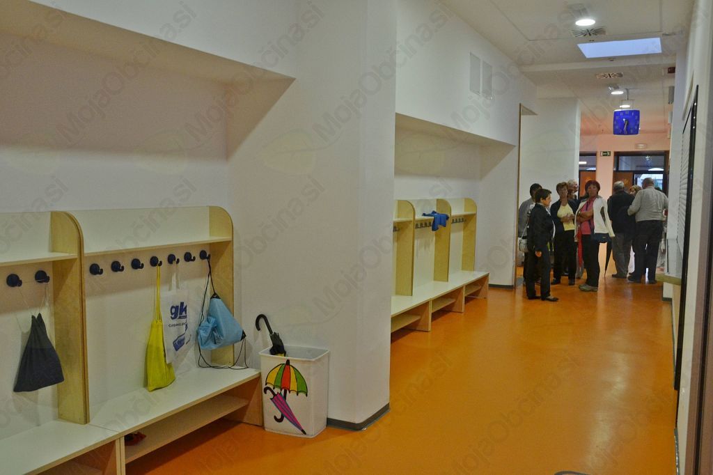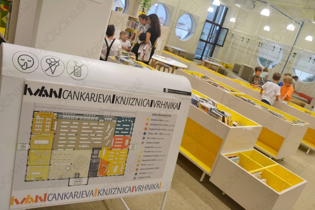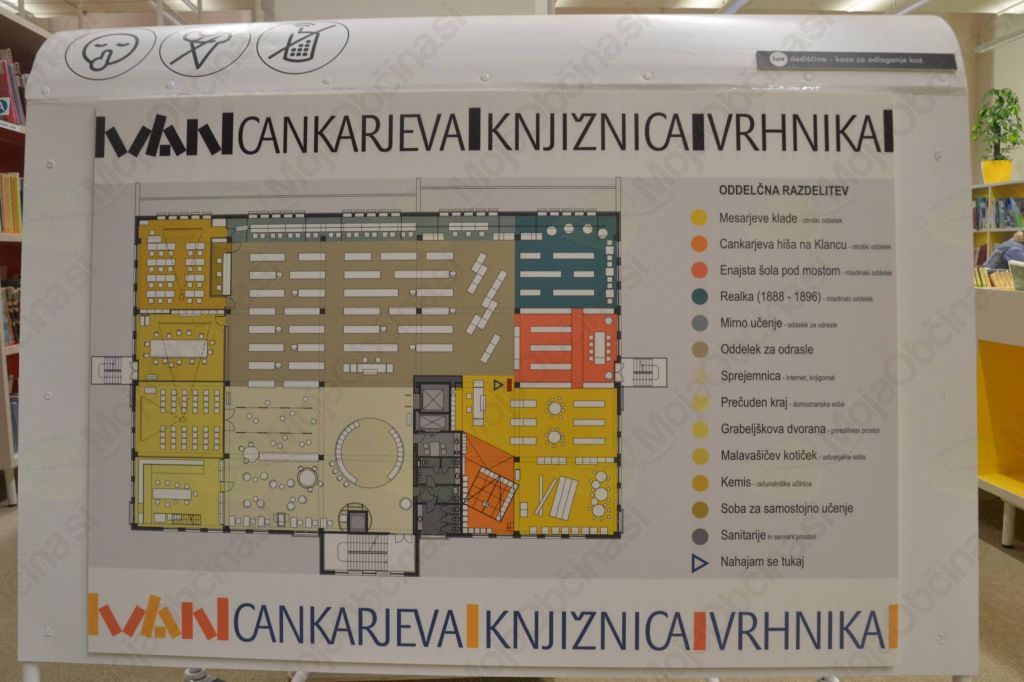 Polovica pritličja je predvidena za doživljajski center o Ljubljanici, ki je odvisen od zunanjih sredstev, zato občina še čaka z njegovo realizacijo. Kot je dejal podžupan Skodlar, bi radi z njim do leta 2020 na Vrhniki povečali obisk turistov za 20 tisoč. Druga polovica pritličja je telovadnica in zaklonišče. V medetaži ima svoje poslovne prostore vodstvo knjižnice, tam se nahaja tudi strojnica. V prvem nadstropju je nastanjena knjižnica, čisto na vrhu pa tretji razredi osnovne šole. Na slovesnem odprtju so si obiskovalci, ki bi jih lahko šteli v več sto, ogledali obe etaži in večina je bila nad videnim navdušena, saj gre za velike, svetle, moderne in očem prijetne prostore. Kot smo že večkrat zapisali, je rdeča nit opreme v knjižnici nekdanja oprema iz šivalnice, s poimenovanjem ožjih oddelkov in konferenčnih sob pa so se poklonili tudi lokalnim pisateljem: Cankarju, Grabeljšku in Malavašiču.