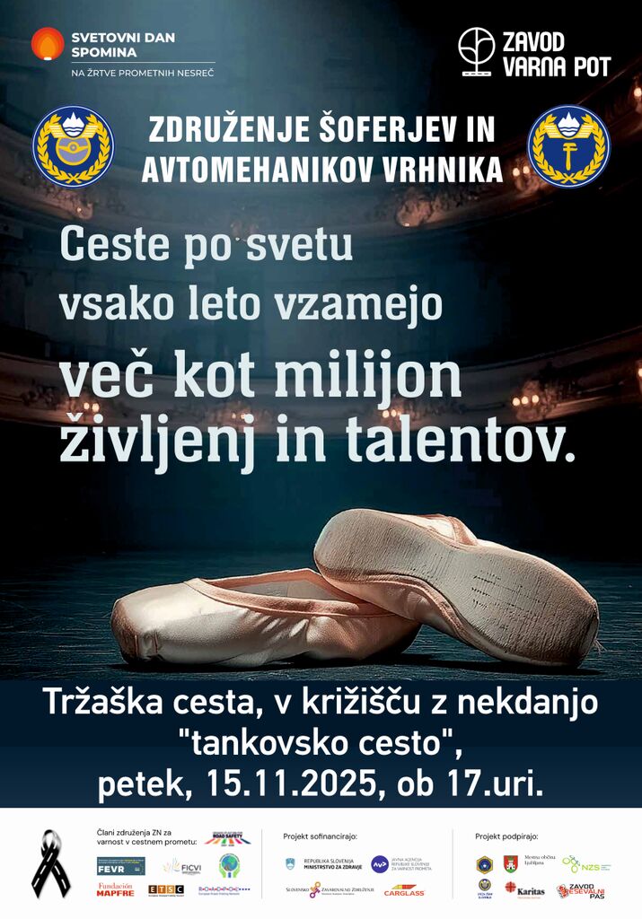Združenje šoferjev in avtomehanikov Vrhnika vas ta petek, 15. novembra, vabi na dogodek, ki bo organiziran ob svetovnem dnevu spomina na žrtve prometnih nesreč. Dogodek bo ob 17. uri na logaškem klancu, kjer se stikati Tankovska in Tržaška cesta.