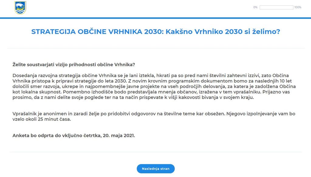 Anketo najdete na https://www.1ka.si//vrhnika2030. Odprta bo do vključno četrtka, 20. maja 2021.