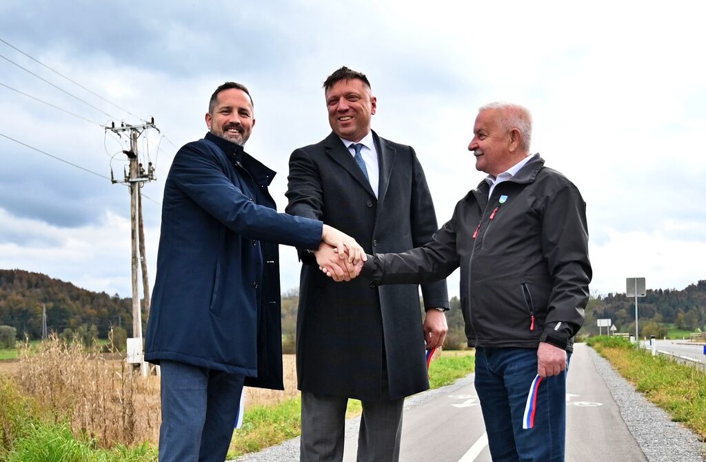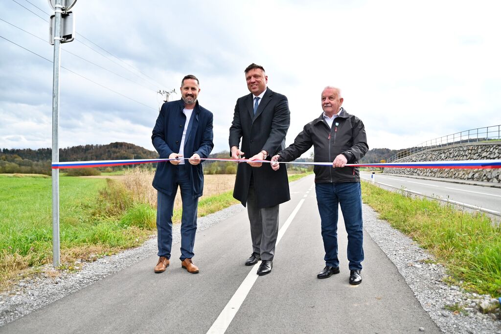 Horjul, 22. oktober – Vrhniški župan Daniel Cukjati, horjulski župan Janko Prebil in državni sekretar Andrej Rajh so z rezom slavnostnega traku tudi uradno predali svojemu namenu prenovljeno regionalno cesto in novo kolesarsko stezo Vrhnika–Horjul.