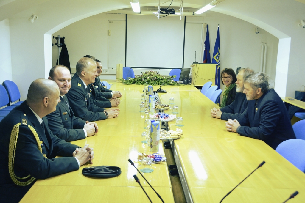 Vrhnika, 20. december – V sejni sobi občine so se na županovo povabilo na vljudnostnem – prednovoletnem sprejemu pomudili predstavniki Slovenske vojske, in sicer poveljnik Združenega operativnega centra brigadir Klemen Medja, poveljnik Enote za podporo brigadir Ernest Anželj, namestnik poveljnika Enote za komunikacijske in informacijske sisteme major Edvard Arnuga, poveljnik Enote vojašnice major Ivan Maslo ter pribočnik poveljnika Združenega operativnega centra Darko Sušnik. Goste so sprejeli župan Stojan Jakin, direktorica občinske uprave Vesna Kranjc in občinski svetnik Vid Drašček.