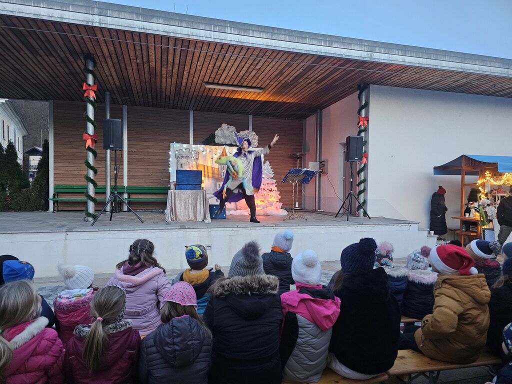 Zimska pravljica na občinskem trgu v Horjulu je dobila svoj pravi pomen z obiskom pravljične Snežne kraljice, ki se pripravlja na novoletno praznovanje in pričara celo sneg!