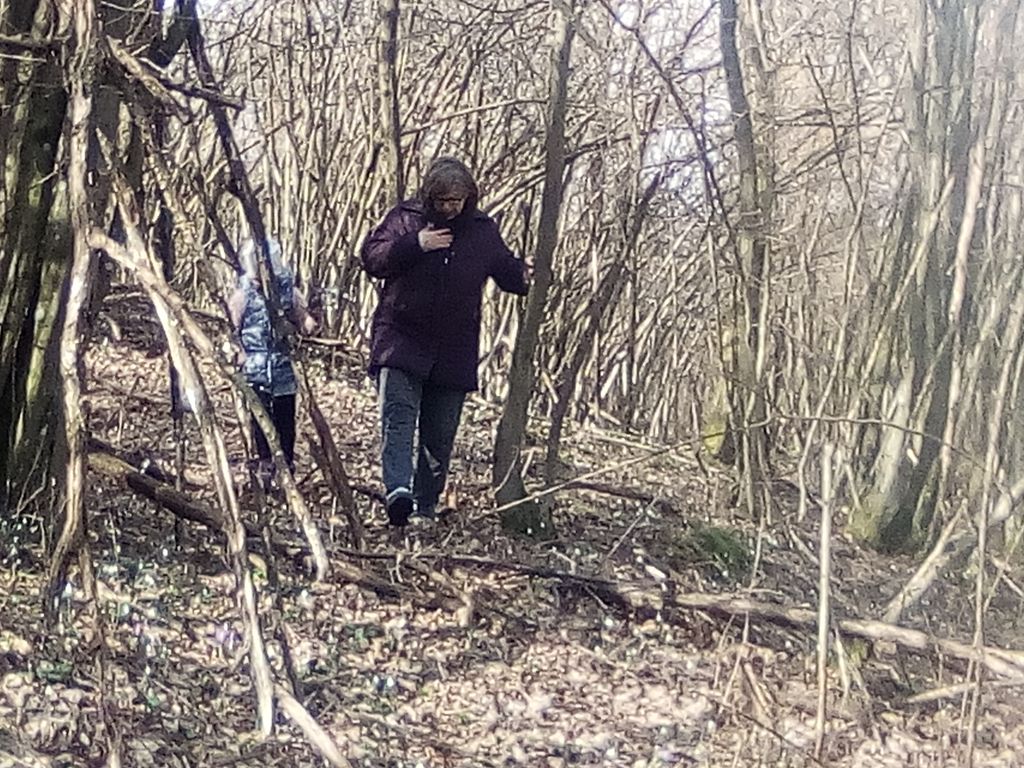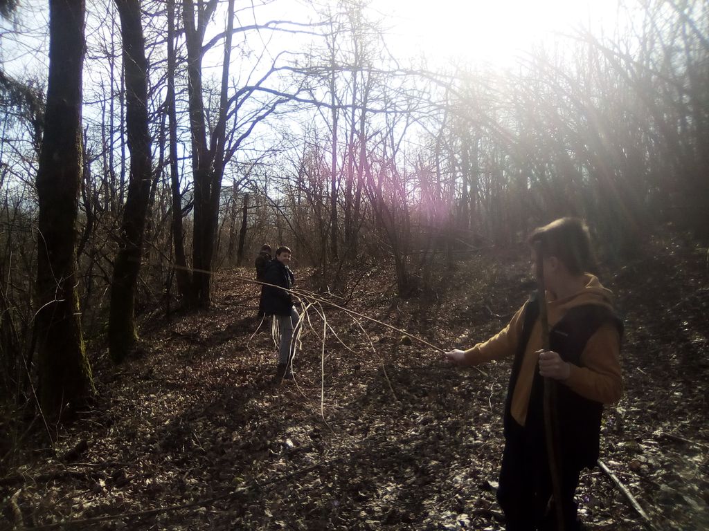 Naš gozdni kotiček je posut z belimi glavicami zvončkov in prav truditi se je treba, da jim ne stopimo na glavo. Nabrali smo veje s kleščami in zložljivo žago, nato smo jih očistili razvejanih vejic, da je pletenje lažje. Malo dekle, ki se ni našlo v tem 'zahtevnem' delu, se je potopila v opazovanje in nabiranje spomladanskih cvetnic in mamo razveselila z umetelnim šopkom, zavitim v mah, da ne bi uvel.
