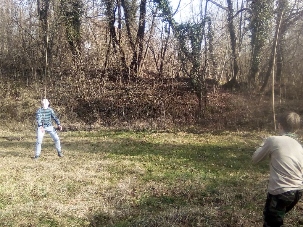 Po vrnitvi smo nabrali veje in zakurili ogenj. Eden je napulil suhe trave in jo potisnil v srce ognja za netivo, drugi je ogenj prižgal, vsi pa so ga vzdrževali do primerne gorkote, ki bo dišeče popekla kosilo. Med tem so nabrane palice uporabili za urjenje... z debelim koncem so palico dali na prst in jo držali v ravnotežju tudi po več minut... kar zahtevno, ker palica ni ravno odrezana in tudi tla so bunkasta. Kako malo potrebujejo, da se z naravo zaposlijo.