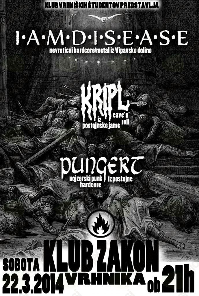 Ravno tako veteranskega porekla pa so tudi postojnski Kripl, ki smo jih na vrhniki že imeli moč videti v obliki bendov, kot so Leponex, Akedeia, Bodgan… in še kaj bi se našlo. Tokrat nam bodo predstavljali svojo vizijo mračnega doom rock’n'rolla, ki se sprehaja nekje med Black flag in Darkthrone. Lani so izdali prvenec Adelbergs frost, kmalu pa se obeta tudi novi album z naslovom From the depths.