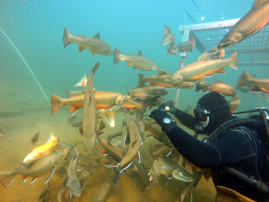 Jezero je pravzaprav akumulacijsko jezero, katerega voda je pozimi namenjena zasneževanju bližnjega smučišča, pri tem pa skrbno pazijo, da je vode v njem vedno dovolj za normalno življenje rib. Te so vanj naselili umetno in ribe so, poleg podvodnega parka, velika atrakcija. V jezeru plavajo poleg slovenske avtohtone soške postrvi tudi potočne postrvi, atlantski lososi, krapi, japonski krapi KOI ter različne vrste jesetrov, med katerimi še posebej izstopa redka vrsta belega albino jesetra, ki mu rečejo Alpska kraljica.