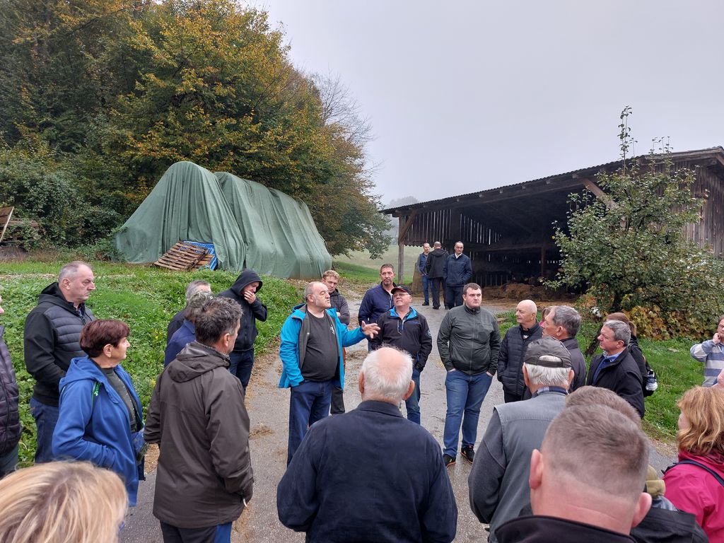 Po letu dni znova organizirana strokovna ekskurzija z govedorejskim društvom dr. Janez Verbič Vrhnika. Tokrat nas je pot peljala v Savinjsko regijo. Tudi letos je bila pobuda upravnega odbora društva, da se v okviru letnega plana organizira strokovna ekskurzija. Na sestanku je bila izražena želja, da bi si ogledali mlečne kmetije ter podjetje, ki izdeluje strojno mehanizacijo. Na pot smo se odpravili v soboto 19.10 v zgodnjih urah. Prva kmetijo, ki smo jo obiskali, je mlekarska kmetija Podpečan, ki se ukvarja s predelavo mleka. Dobrodošlico nam je izrekel Andrej Podpečan, ki se s kmetijstvom na domači kmetiji ukvarja že celo življenje. Kmetija se nahaja v Žalcu, natančneje v Galiciji. Kmetija obdeluje 44 hektarjev kmetijskih površin in redi okoli 130 glav živine s prevladujočo rjavo pasmo. Zaradi intenzivne prireje prevladujejo njivske površine na katerih se prideluje predvsem koruza, sirek, lucerna ter pšenica. Zaradi novih pravil pogojenosti v sklopu Dobri kmetijski in okoljski pogoji (DKOP) mora zaradi prevladujoče koruze izvajati ozelenitev preko zime pri triletnem kolobarju oziroma osnovni dvoletni kolobar. Kmetija je vključena poleg osnovnih plačil (neposredna plačila, omejeni dejavniki - OMD) tudi v intervencijo Shema za okolje in podnebje (SOPO), saj izvaja že omenjene ozelenitve preko zime (ZEL) ter gnoji z organskimi gnojili z majhnimi izpusti v zrak (NIZI). Za izvajanje zahtevka NIZI ima kmetija na voljo gnojevko ter strojno mehanizacijo, ki direktno aplicira gnojevko na/v tla. Kmetija je vključena tudi v Kmetijsko okoljska podnebna plačila (KOPOP), saj ima izračunane krmne obroke ter Dobrobit živali (DŽ), saj ohranja čredo proste Bovina virusne diareje (BVD). Andrej nam je razkazal novi hlev, predelovalni objekt, zorilnico ter prodajalnico (mlečni in suhomesnati izdelki). S predelavo mleka na kmetiji se ukvarja hčerka Martina. Kmetija ima v sklopu degustacije tudi wellness center. Andrej Podpečan pri predstavitvi kmetije (foto: Matej Vidrih).Pot smo nadaljevali v podjetje SIP, ki izdeluje strojno mehanizacijo. Ker ob sobotah ni obrata izdelave strojev smo si ogledali razstavni salon. V kratki in jedrnati predstavitvi nam je bilo predstavljeno delovanje podjetja v zadnjih 70 letih od ustanovitve, trg prodaje mehanizacije ter opis mehanizacija znotraj razstavnega salona. Podjetje je na koncu podarilo vsakemu udeležencu kapo ter svinčnik, najmlajšim sestavljanko.Predstavitev podjetja SIP (foto: Matej Vidrih)Ker smo bili časovno omejeni smo se morali odpraviti na pot, saj je bila na sporedu še kmetija Čretnik, ki je dobila leta 2023 naziv Naj hlev Ljubljanskih mlekarn. Kmetija se nahaja v Žalcu, natančneje Pernovo. Kmetija obdeluje 33,5 hektarjev kmetijskih površin in redi okoli 90 glav živine s prevladujočo črno-belo pasmo. Zaradi intenzivne prireje mleka prevladujejo njivske površine na katerih se prideluje predvsem koruza za silažo, deteljno-travne mešanice, lucerna ter žita. Kmetija poleg zgoraj naštetih ukrepov, ki jih izvaja kmetija Podpečan, tudi Konzervirajočo obdelavo tal (KONZ), Precizno gnojenje in škropljenje (PGS) in Kolobar 1 (KOL 1). Pred vstopom v hlev nam je nosilec kmetijskega gospodarstva Simon Čretnik dal obujke zaradi možnega prenosa predvsem bolezni, saj večina obiskovalcev doma redi govedo. S tem smo izboljšali biovarnost, saj lahko tudi ljudje prenašajo bolezni (vektorji) preko okužene opreme in oblačil (Bovina virusna diareja, zimska driska, dermatofize, respiratorne bolezni).Po končanem ogledu kmetij smo se odpravili na kosilo na izletniško kmetijo Potočnik (Prebold, Matke), ki ima s tem namenom odprto tudi dopolnilno dejavnost. Po končanem kosilu pa smo tudi letos podelili kipec Pastirček. Kipca prejme najboljši pastir oziroma pastirica goveda. Podelitev lesenega kipca je na območju Vrhnike tradicionalna že od leta 2008, in sicer lesenega kipca za leto dni prejme najboljši pastir ali pastirica, ki pase živali na način, da je travinje kar se da dobro popaseno in da travna ruša ni poškodovana. Letos je kipca prejela mlada kmetica Tjaša Gabrovšek. Čestitke!