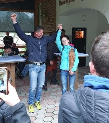 Predsednik društva Simon Stržinar podeli kipec Pastirček najboljši pastirici za leto 2024 Tjaši Gabrovšek