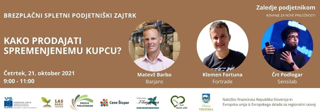 4. PODJETNIŠKI ZAJTRK: Kako prodajati spremenjenemu kupcu? KDAJ: četrtek, 21. oktober 2021, med 9:00 in 11:00 KJE: spletna platforma ZOOM (dan pred dogodkom boste prejeli povezavo) OBVEZNA PRIJAVA: https://forms.office.com/r/CQaLfywhfc