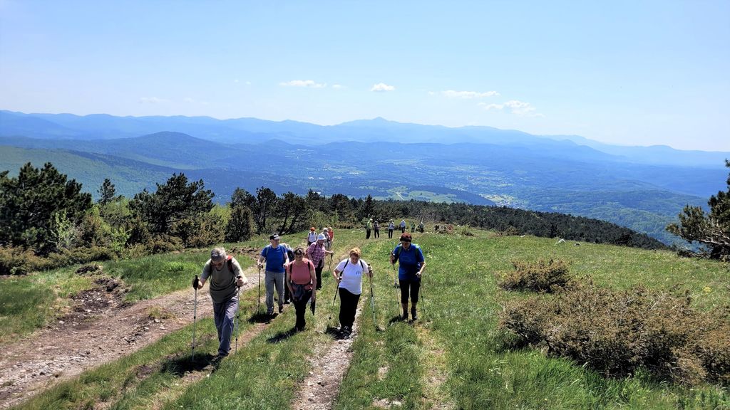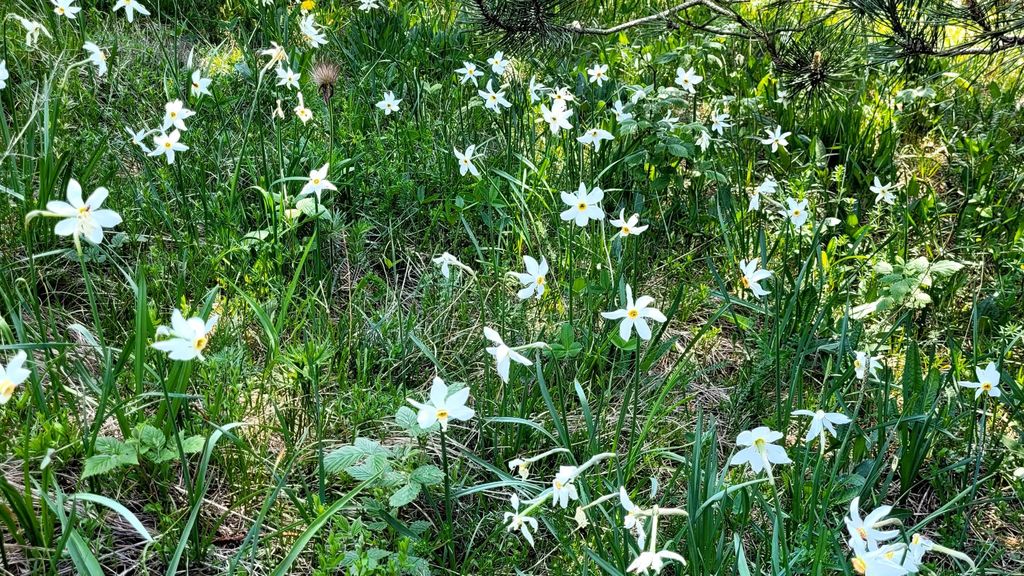 Ko smo stopili na travnati deli pobočja, so nas razveseljevale bele lepotice narcise, šopi grebenuš in mnogo rumenega raznovrstnega cvetja. Po nebu pa so krožili drobni škrjančki in neutrudno peli.