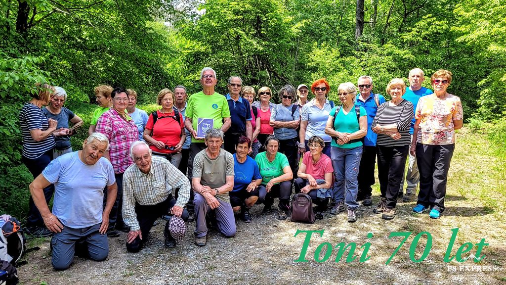 Nato smo pot nadaljevali proti Senožečam in se razveselili cvetočih potonik. Že malo utrujene nas je v bližini čakal »rumenko«. Tu smo še zapeli in nazdravili jubilantu Tonetu.