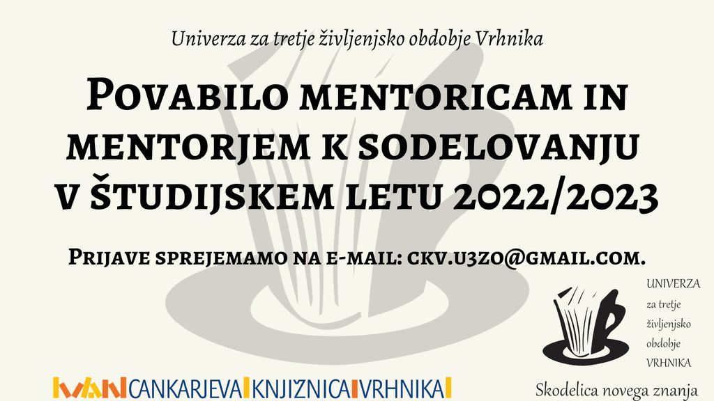 Univerza za tretje življenjsko obdobje (U3ŽO) Vrhnika vabi k sodelovanju mentorice in mentorje za študijsko leto 2022/2023. K sodelovanju vabimo mentorje in mentorice z dokazili o ustrezni formalni izobrazbi, ki imajo pozitiven odnos do starosti in starejših in so pripravljeni izobraževanje izvajati tudi preko spletnih aplikacij.