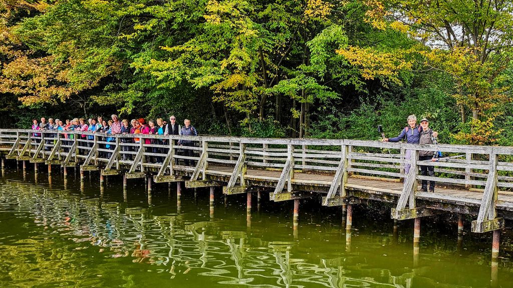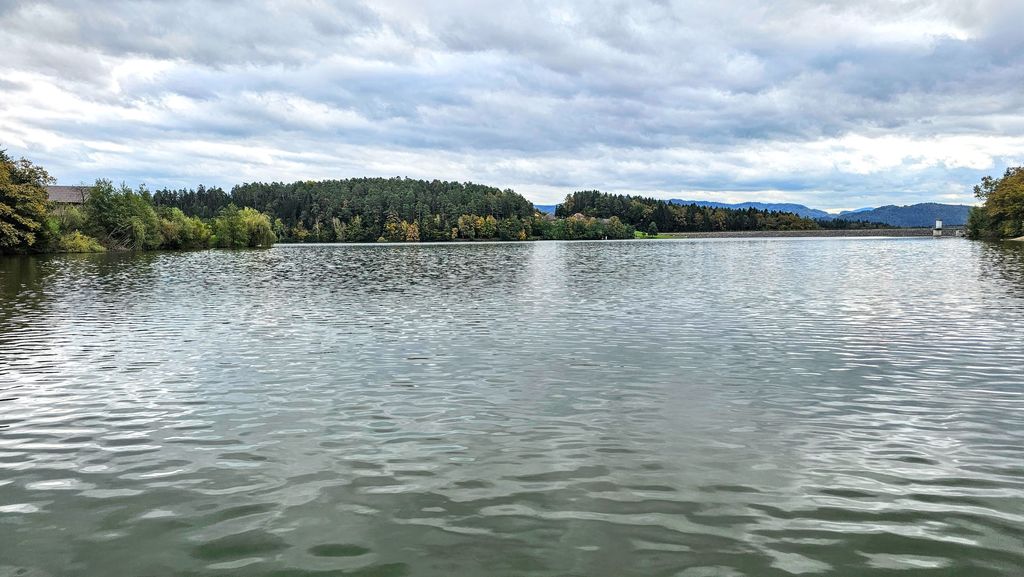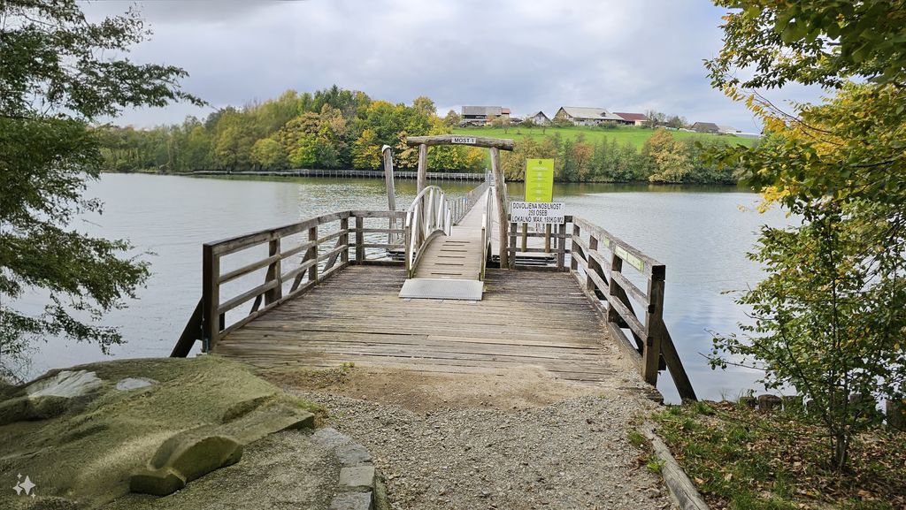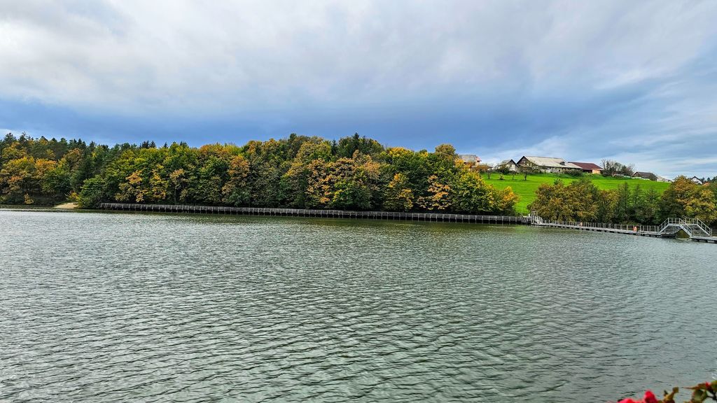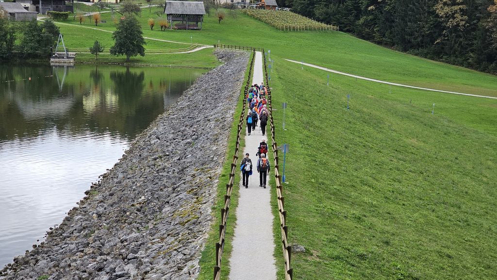 Z glavnega parkirišča smo se po ličnih kamnitih stopnicah povzpeli na rob jezera in po nasipu, kjer je urejena sprehajalna pot, nadaljevali ob jezeru do mokrišča, ki so ga premostili z mostičkom.