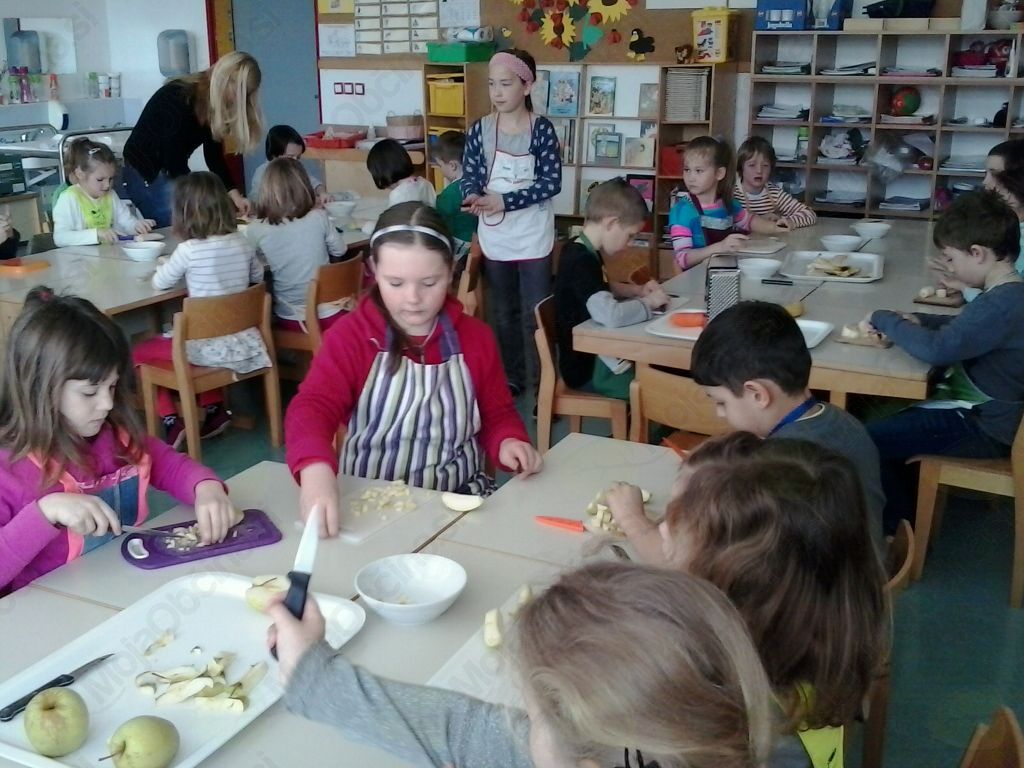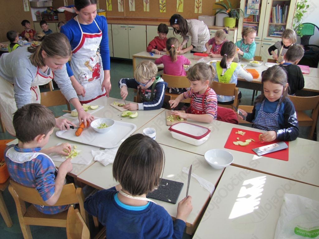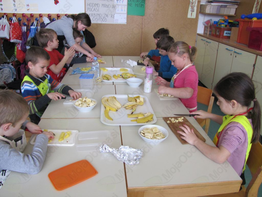Učenke 6. razredov so nam predstavile prehrambeno piramido. Tako smo spoznali, katera živila je priporočeno jesti več in katera manj. Nato je sledila priprava jogurta s sadjem. Pred začetkom smo se spraševali, ali je jogurt lahko dober in slasten tudi brez dodanega sladkorja. Oblekli smo si predpasnike, pripravili orodje, umili roke in sadje ter pričeli z rezanjem sadja in zelenjave. Majhne koščke smo zmešali z navadnimi jogurti in naredili tri različne vrste sadnih jogurtov. Sledila je degustacija. Izpraznjeni lončki ter nasmejani obrazi so bili zadosten dokaz, da je lahko navaden jogurt s sadjem in zelenjavo prav okusen obrok, ki lahko nadomesti sladke prigrizke in je zelo zdrava malica.