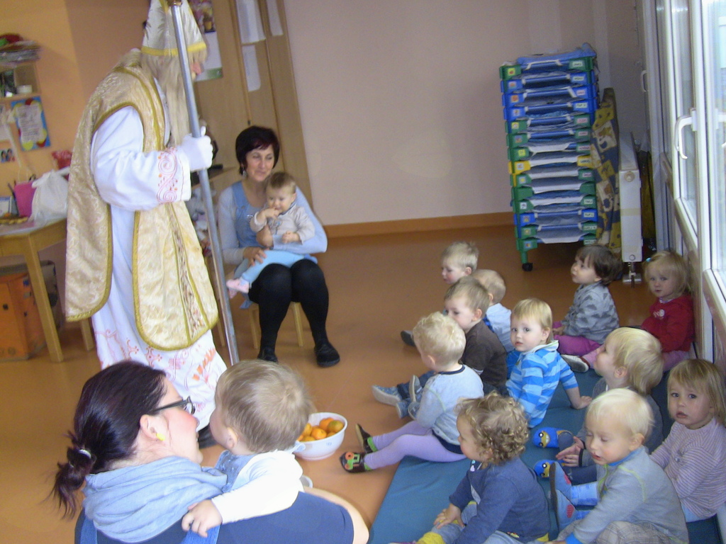 V najmlajši skupini Angelčki hladne dni preživljamo zelo pestro. V novembru smo preizkušali svoje motorične sposobnosti. Veliko smo sestavljali, nizali, vstavljali, se plazili, plezali in tako poskrbeli, da smo vsak dan gibalno napredovali. V adventnem času se vsako jutro zberemo na blazini, prižgemo svečko, pozdravimo Jezusa in Marijo, zapojemo več pesmi in preberemo zgodbo. Nato sledijo predvsem dejavnosti s področja umetnosti. Vsak torek nas obišče tudi duhovnik in nam v Beli dvorani predstavi adventno zgodbo za tisti dan. Z decembrom pa smo naredili tudi velik korak k samostojnosti otrok. Vsi otroci so sprejeli kahlico kot del dnevne rutine, kar je za nas vzgojiteljice velik uspeh. Samostojnost pri hranjenju in pitju pa je že od septembra naša vrlina.