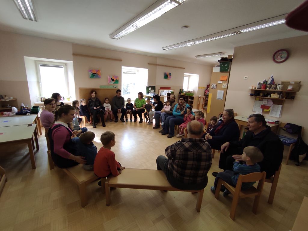 Za zaključek vseh teh dejavnosti smo v vrtec povabili dedke in babice naših otrok. Prišli so iz različnih delov Slovenije. Skupaj z otroki so se igrali različne družabne igre, ustvarjali iz odpadnega materiala, gradili, zlagali in peli. Pogovorili smo se, kako so oni v mladosti preživeli otroštvo brez kupa igrač, oblačil in plastike. Otrokom in nam so polepšali dan.