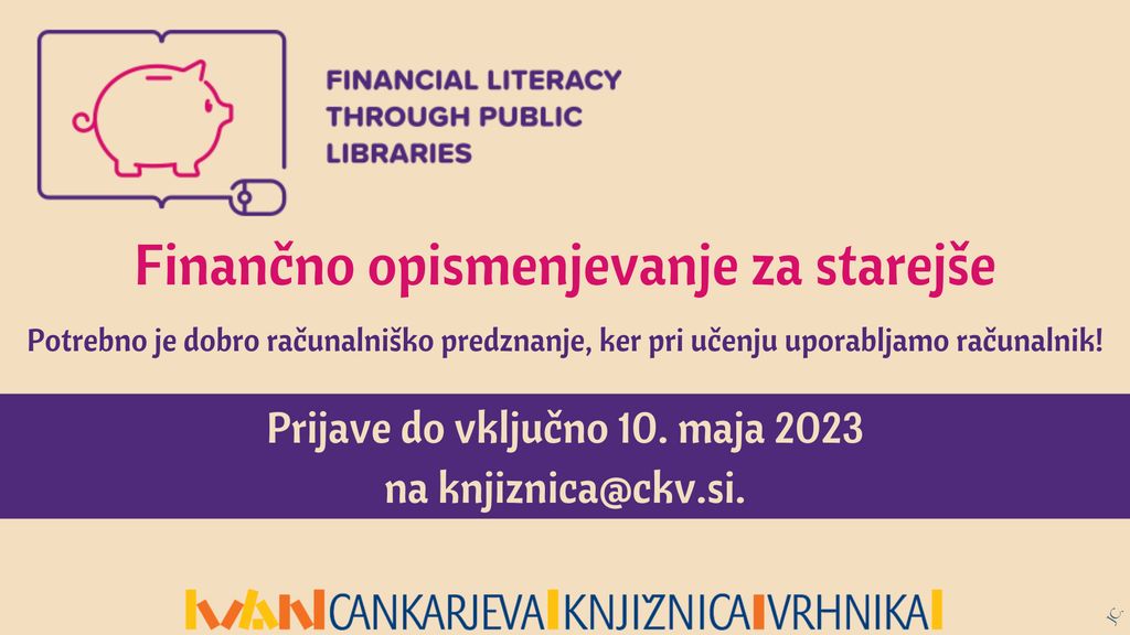 V mesecu maju bomo začeli s Finančnim opismenjevanjem za starejše-FINLIT. Uvodno srečanje bo v sredo, 17. 5. 2023, ob 9.00 v Računalniški učilnici. Skupaj si bomo ogledali spletni tečaj, ki na osnovni ravni vključuje module finančno načrtovanje in osebni proračun, finančni sistem, kredite in posojila, zavarovanja ter varstvo potrošnikov in njihove pravice.