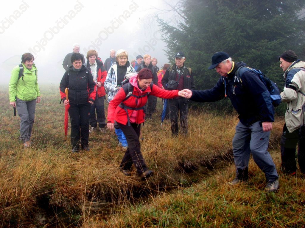 Na samotnih poteh skozi gozdove smrek, jelk, bukev, rdečega bora in brez nismo srečali nobenega pohodnika, živali pa so se verjetno umaknile v zavetje gozda, preden bi jih opazili. Ponekod je zlato mokro listje prekrivalo poti in naredilo hojo v meglicah oblačnega dne še bolj mehko in nežno. Pohodniki so čebljali, občasno pa poslušali Zoranova pripovedovanja o življenju na Blokah in o mladostnih dogodkih, ki jih je doživel na Blokah. Kmalu smo prišli do vasi Ravnik. Ustavili smo se pri vodnjaku, ki ga je dal postaviti turjaški grof Auersperg in občudovali izvir, čigar voda nikoli ne presahne, iz dna pa se na različnih mestih dvigajo zračni mehurčki. Za vasjo Ravnik se je pot obrnila čez položne bloške travnike nazaj proti jezeru. Pričelo je deževati. Pod pisanimi dežniki smo prispeli do brunarice in vstopili v avtobus.