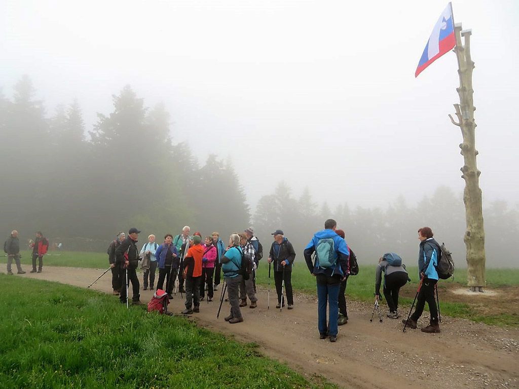 Jutro 9. maja je bilo oblačno in hladno, nizki oblaki so segali do Smrečja. Vendar nas to ni odvrnilo od namena, da se preko Lavrovca povzpnemo na Goli vrh v masivu Žirovskega vrha. Na Lavrovcu nas je obdajala megla, ki je vztrajala že drugi dan, zato na heliografu ni bilo prežgane sledi, ki bi beležila sončno sevanje. Z vrha smo se ob gozdnem robu, polnem mladih jerebik, spustili na cesto in po njej nadaljevali proti Golemu vrhu. Pri zadnji kmetiji smo poklepetali z gospodarjem, nato pa se ustavili pri bunkerju Rupnikove linije, nad katerim je vihrala slovenska zastava. Medtem, ko smo malicali, je prišel sogovornik s kmetije in odprl vhod v betonski bunker. Notranjost je delno obnovljena, ima lesen opaž, dva pograda, mizo in malo peč, po stenah so slike, uniforma, nekaj pušk, stari nahrbtniki …. V mislih smo se preselili v čas pred desetletji, ko so se narodi v Evropi bali drug drugega in gradili obrambne linije.