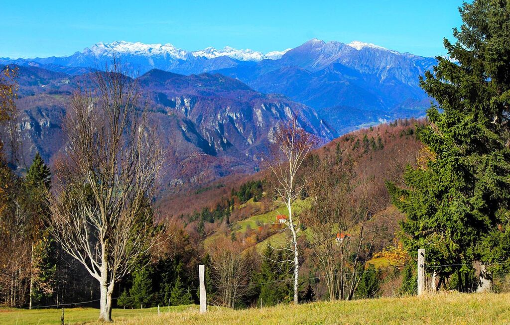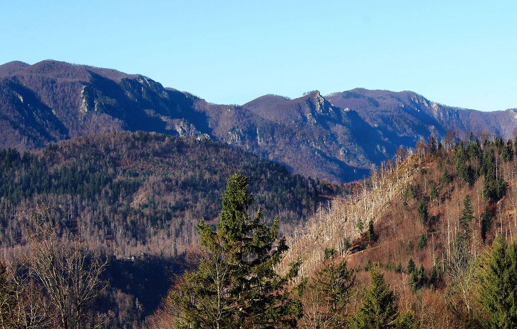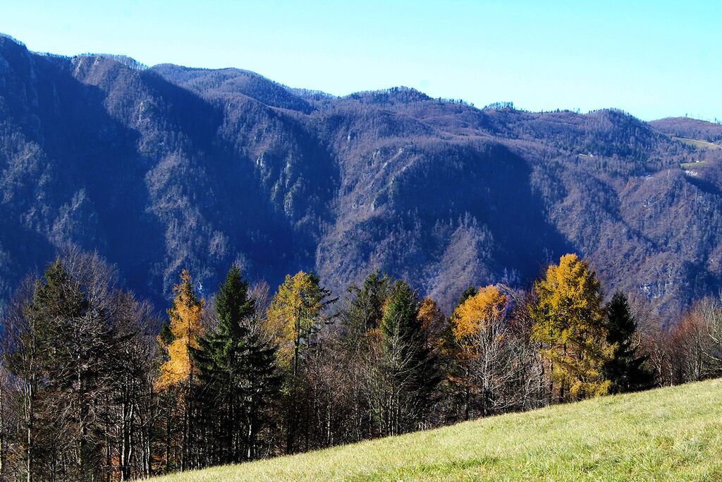 Na Bendijskem vrhu, kjer smo si na sončku pod osamelim macesnom z rumenimi iglicami privoščili počitek in malico, se nam je odprl pogled na Julijce, na Karnijske Alpe v daljavi ter še dlje na obzorju na Dolomite. Oko pa se je ustavilo na nasprotni strani, na strmih stenah Poldanovca in grebenu, kjer se Trnovski gozd prevesi v globoko dolino Trebuščice. Neverjetno divje izgleda in skorajda nedostopno, čeprav iz te doline vodi na Poldanovec pot, ki pa terja previden korak.