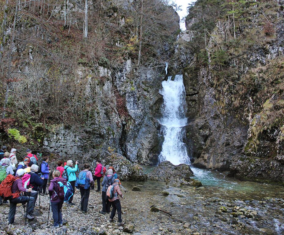 smo po gozdni poti do kmetije Brdar, pod katero buči Brdarjev slap, prvi od
