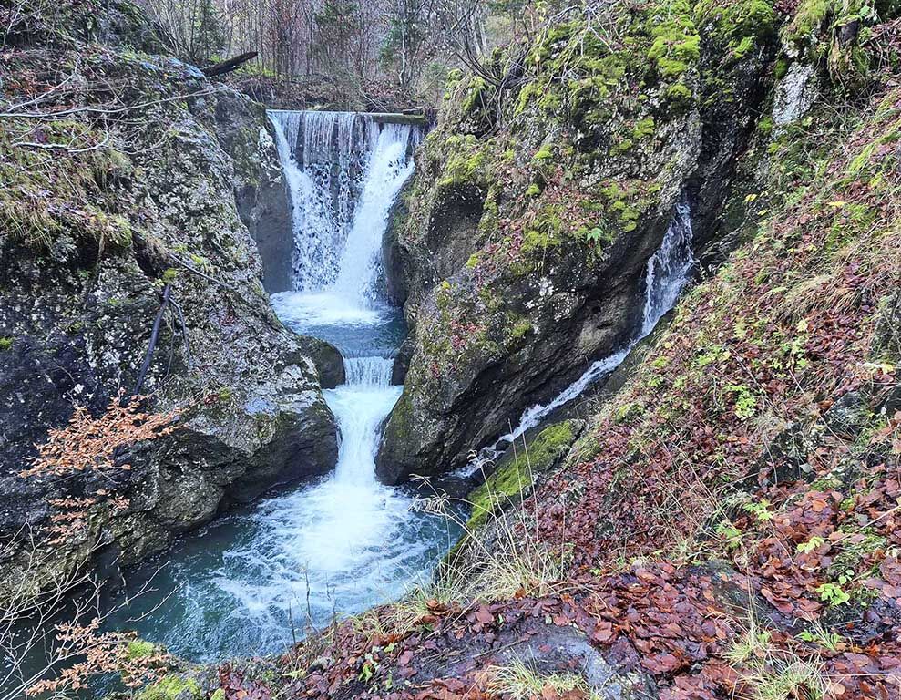 štirinajstih v soteski potoka Gačnik. Pogled na slap in prelivanje potoka preko