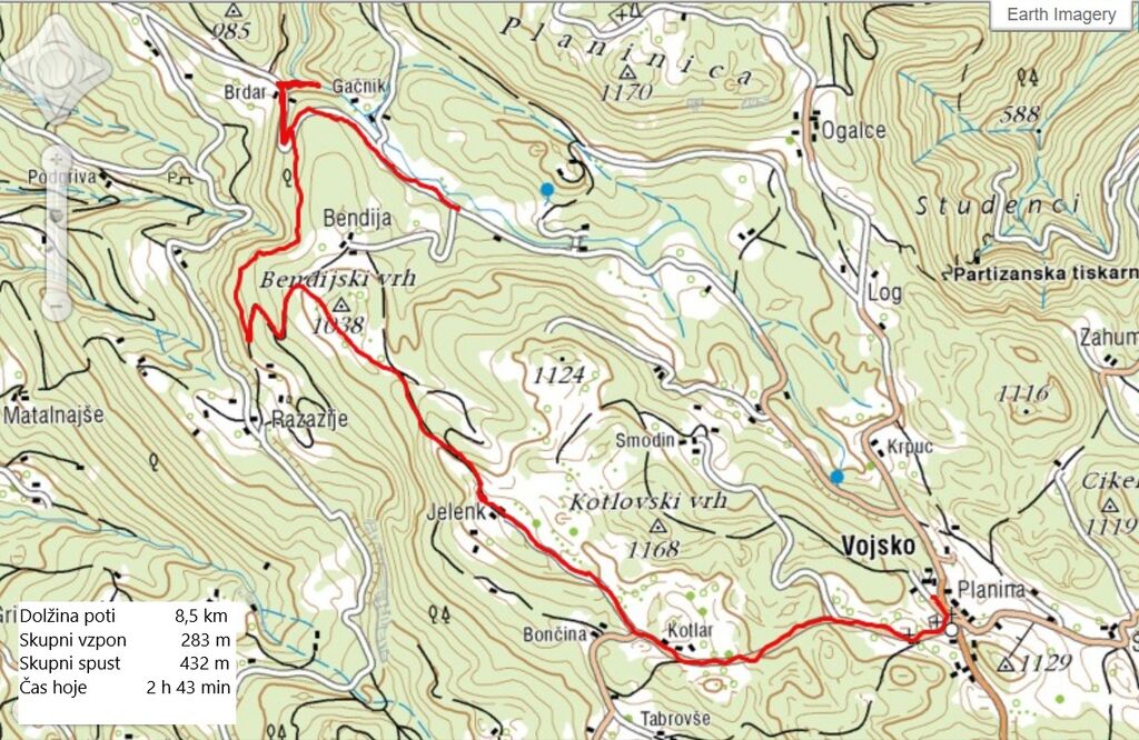 Odpravili smo se mimo kmetij Kotlar in Jelenk proti Bendijskemu vrhu (1038 m). Pot ni bila naporna, saj poteka po rahlo valovitem svetu planote, kjer se razprostirajo travniki, senožeti in mešani gozdovi. Večino planote sestavljajo apnenci in dolomiti, ki pogojujejo oblikovanost površja. Vodoprepustni apnenec tvori svet z značilnostmi krasa in njegovih pojavov. Kot zanimivost na Vojskarski planoti so dolomitni visoki kamniti stolpi, še posebej sta zanimiva dva skalna osamelca sredi travnika, ki smo ju občudovali na poti proti vasi Vojsko. Na planoti vlada gorsko podnebje, kjer so poletja sveža in relativno kratka, zime pa mrzle z dolgotrajno snežno odejo. Zato ne preseneča, da je na njej veliko prelepih terenov za tek na smučeh.