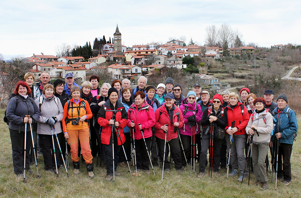 V Šmarju nad Koprom smo zapustili avtobus, si oprtali nahrbtnike in čas je bil, da se razgibamo. Po E 6 smo se napotili proti Pomjanu, kraju, kjer so snemali priljubljeno serijo Usodno vino. Ker je naš član Jože praznoval »senijorski« jubilej, sta nas z vedno nasmejano ženo Ivanko presenetila in pogostila s sveže pečenimi belokranjskimi dobrotami.