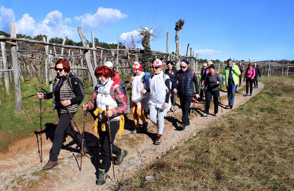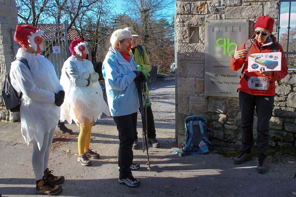 Januarja smo se temu cilju odpovedali zaradi burje, čez mesec dni pa nas je na pustni torek pričakalo modro nebo in prijetna, skoraj pomladanska toplota. Iz najvišje ležeče kraške vasi Avber smo se odpravili na krožno pot, ki jo je načrtoval naš pohodnik Srečko Kenk in je bila še enkrat daljša od tematske Poti kavadurjev, ki tudi poteka v okolici Avberja.