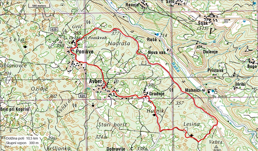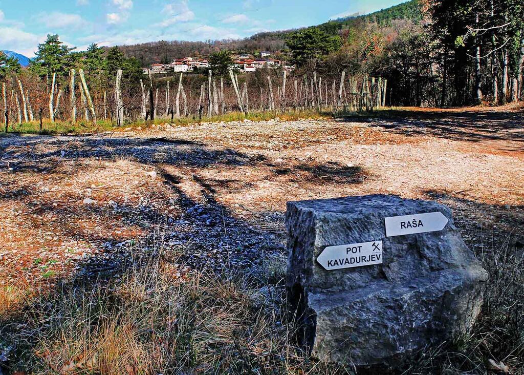 Do bližnjega zaselka Gradnje nas je spremljala pokrajina obdelanih polj, travnikov in vinogradov, nato pa smo nadaljevali skozi redek gozd črnega bora in grmišč do opuščenega kamnoloma, enega od mnogih v okolici Avberja. Kamnolom je bil obdan s kupi neuporabnega kamenja, v sredini pa je zijala globoka luknja – kava, kjer so nekoč kavadurji z ročnim orodjem lomili apnenec, pomemben gradbeni material Krasa. Kmalu smo prišli na rob nad dolino rečice Raše, ki teče po dolini v smeri JV-SZ, skoraj v ravni liniji, kar je posledica globokega preloma v zemeljski skorji, ki je po rečici dobil ime Raški prelom.