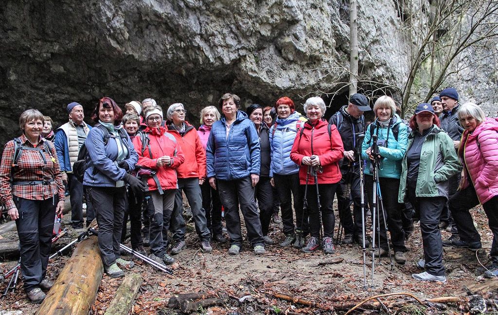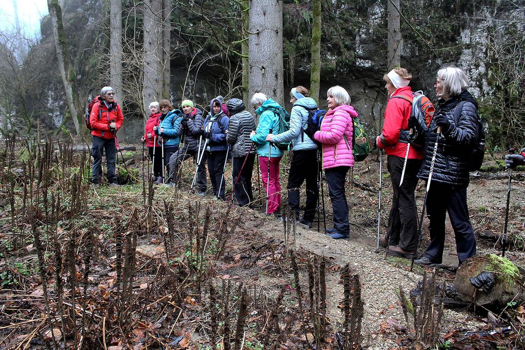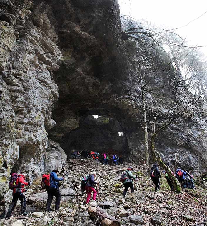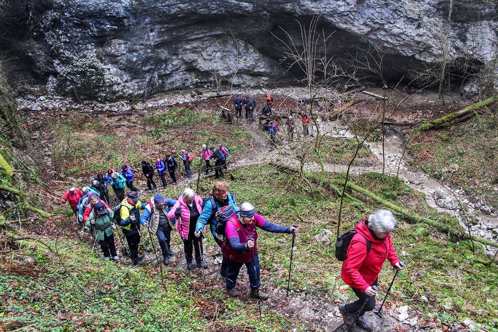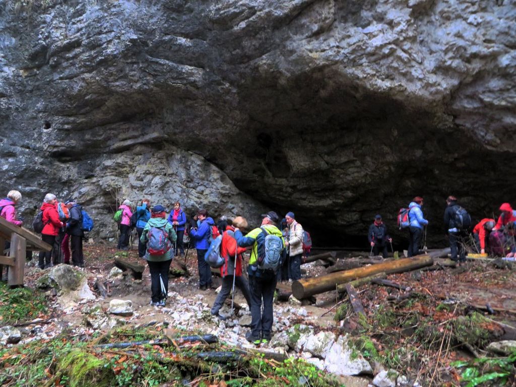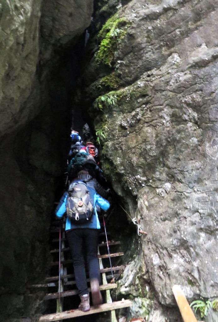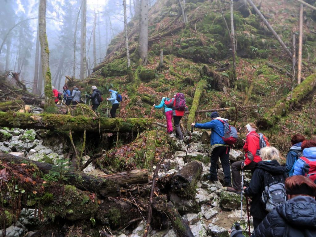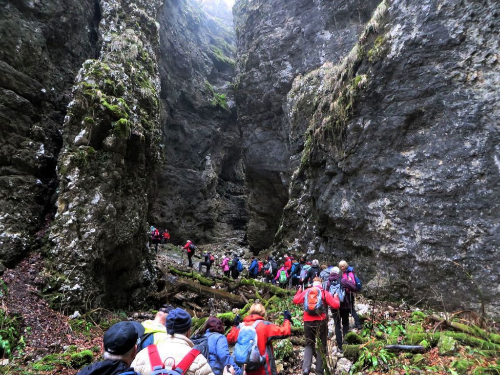 Pri parkirišču smo namesto na široko stezo stopili v hudourno strugo na dnu soteske in se podali navzgor med strme stene, visoke tudi do 150 m. Najprej smo krenili v slepo dolino pogledat, če je dovolj vode, da čez previsno steno pada slap, tokrat ga ni bilo. Povzpeli smo se tudi v Pokljuško luknjo, nato pa mimo možicev pod previsnimi stenami do vrtca z galerijami.