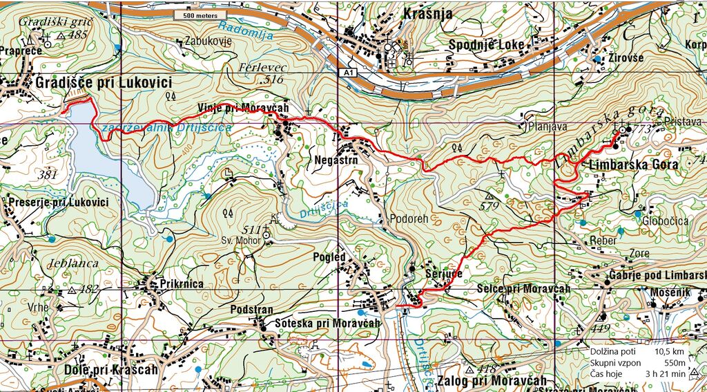 Na goro vodijo številne poti. Mi smo izbrali tisto, ki se začne ob Gradiškem jezeru nad Lukovico. Jezero so zgradili kot mokri zadrževalnik na potoku Drtijščica, ki varuje avtocesto Ljubljana–Maribor pred hudournimi vodami. Okoli jezera je speljana urejena makadamska pot v dolžini 4,2 km. Krajši del te poti smo prehodili tudi mi, a nas je markirana pot kmalu popeljala strmo v breg skozi lep gozd smrek in borov, z borovnicami in praprotjo rebrenjačo v podrasti.