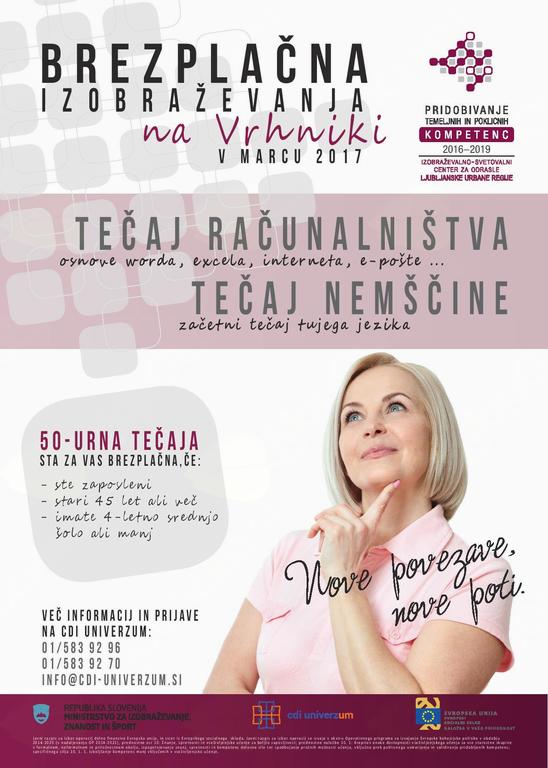 CDI Univerzum v marcu pripravlja brezplačna izobraževanja na Vrhniki, in sicer tečaj računalništva in tečaj nemščine. Kje, kako in kdaj? Več informacij na priloženi fotografiji. gt