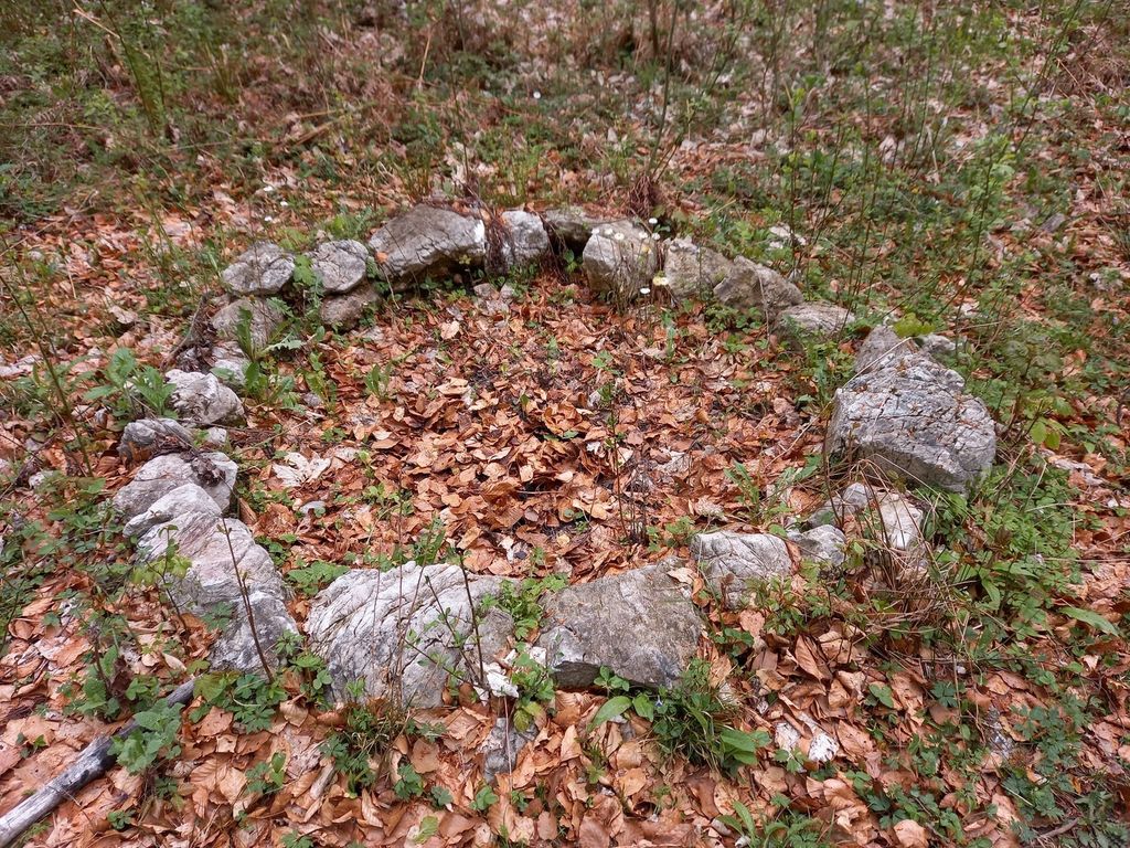 Nedaleč stran od ovalnega svetišča sem odkril na ravnem delu večje vrtače še en dobro ohranjen »kamniti krog« v premeru 2,40 m. Do tega svetišča je dostop po stari poti, ki se uporablja še danes. Nasprotno od skritega ovalnega svetišča je tukaj lokacija pregledna in na ravnem prostoru, kamor je lahko prišlo na čaščenje vsaj sto ljudi. Kaj so častili tukaj je težko ugotoviti, vendar zaradi odprtosti in preglednosti te lokacije mislim, da so tu častili sonce. To svetišče je mlajše, kot ovalno. Dejstvo je, da so ponavadi vsa svetišča – tičnice v bližini gradišč. V tem primeru pa je oddaljenost do najbližjih gradišč pol ure hoda. Vsekakor je na tem prostoru »svečenik« vodil obred in imel glavno besedo.