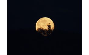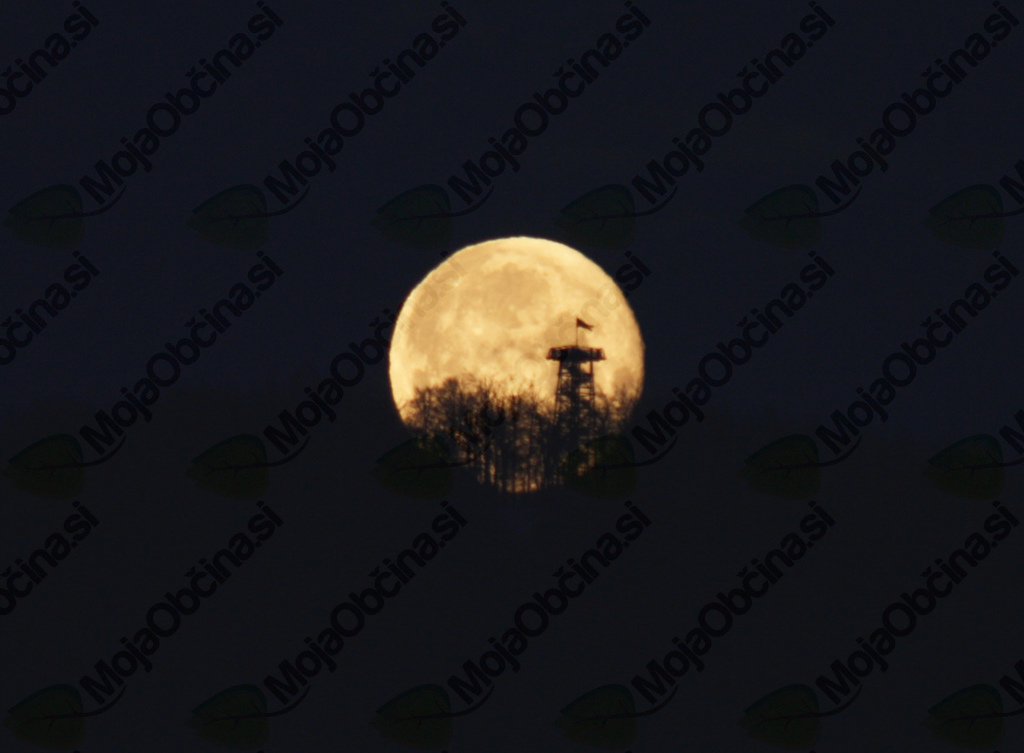 Za nekatere fotografije velja, biti ob pravem času na pravem mestu. Za to fotografijo je zaslužen mož Vojko, ki je videl, da se zahajajoča luna bliža obzorju in me je na to opozoril. Jaz sem hitro šla v pritličje po 300 mm teleobjektiv, odhitela na podstrešje in slikala skozi okno. Časa ni bilo veliko, neverjetno, kako se je luna hitro pomikala čez silhueto stolpa. Nisem imela časa niti preverjati nastavitve.