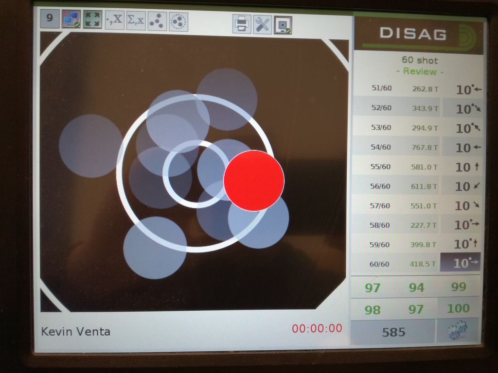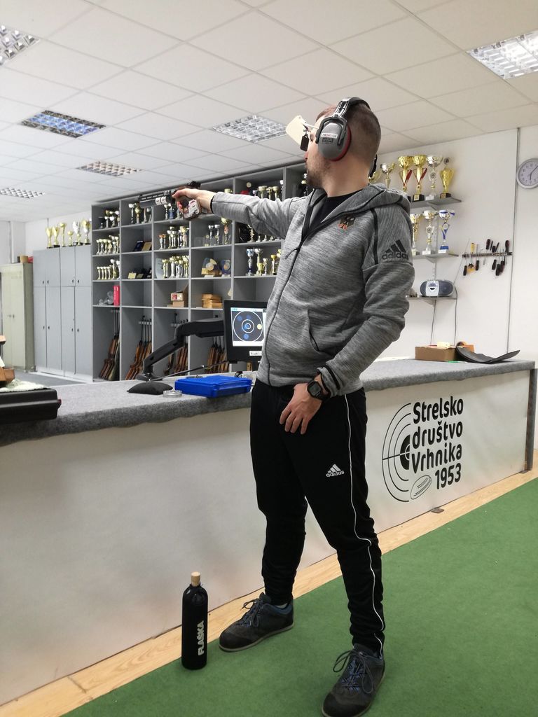 Kevin je na vrhniškem strelišču opravil nekaj treningov z zračno pištolo in pri tem pokazal, da je res mojster tega športa. Že po odličnem rezultatu prvega dne, 580 krogov, je takoj naslednji dan izenačil svoj državni rekord 585 krogov, kjer je v zadnji seriji ustrelil 100 od 100 možnih krogov. Svoj državni rekord je dosegel 17.01.2016 na mednarodnem turnirju v Rušah. V soboto 15.02. je nastopil tudi v 1. državni slovenski ligi, kjer je v kvalifikacijah dosegel 1. rezultat 582 krogov, nato pa svoj nastop še potrdil v finalu, kjer je osvojil 1. mesto. Zadnji trening je na Vrhniki opravil še v ponedeljek, kjer je ponovil odlično streljanje z rezultatom 583 krogov.