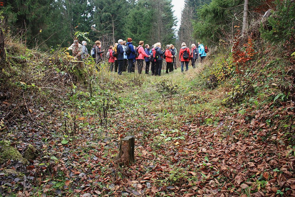 V toplem poznojesenskem jutru smo našo pot na razglednik pričeli na Kalcah. Takoj za avtobusnim postajališčem smo zavili desno in se po nekaj sto metrih ustavili na ostankih trase širokotirne železnice Logatec - Črni Vrh - Ajdovščina. Z gradnjo so pričeli v začetku 1. svetovne vojne, vendar so jo zaradi premika fronte na Sočo opustili. Za potrebe fronte so takoj pričeli z gradnjo ozkotirne poljske železnice, imenovane tudi feldban. V treh tednih so jo zgradili ruski ujetniki. Speljana je bila po cestah in po gozdu nad Zalo in Idrijco. Na železniški postaji Logatec so nalagali na vagončke hrano, sanitetni material in vojaško strelivo. Kompozicijo je sestavljalo 10 vagončkov, ki so jih najprej vlekli 4 konji, kasneje pa lokomotive z bencinskim motorjem.