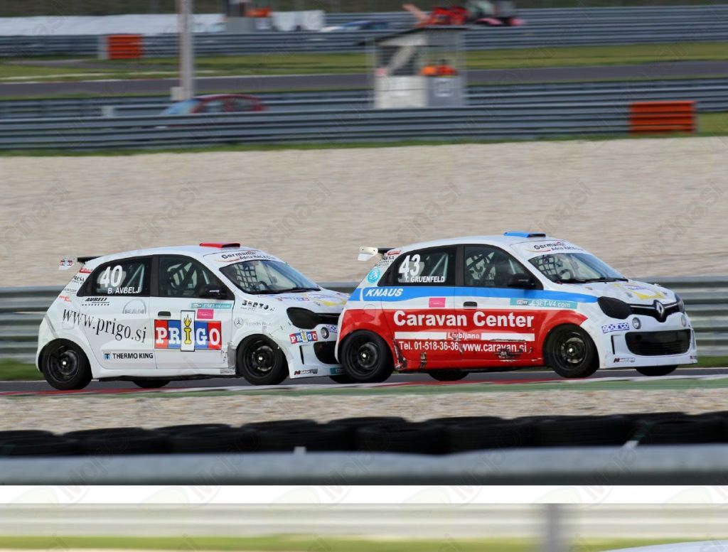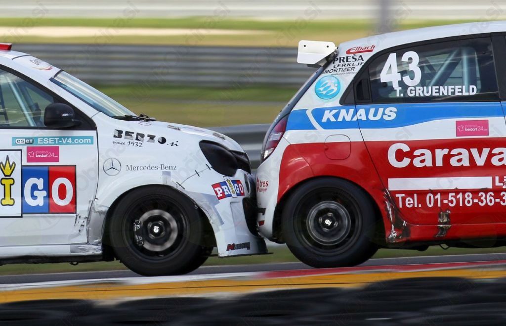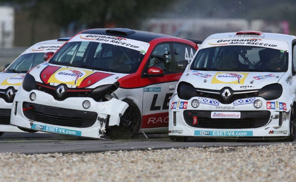 Kvalifikacije v Germanol Adria Twingo Cup so pripadle Luki Glazerju, ki pa na prvi dirki ni vnovčil najboljšega startnega položaja, saj je ni uspel zaključiti. Težave je imel tudi Boštjan Avbelj, ki je na začetku dirke trčil z Marinškom in zletel globoko v peščeno izletno cono. Jaka Marinšek se je zaradi trka celo prevrnil, ter pristal na kolesih. Nekaj ovinkov naprej se je zavrtel tudi Tom Gruenfeld. V ospredju smo bili priča številnim prehitevanjem med Alešem Bužgo, Tomažem Trčkom, Martinom Lengyelom ter Luko Glazerjem. Med tem, ko sta Avbelj in Gruenfeld lovila skupino vodečih, je v pesek zapeljal Tomaž Trček. V končnici dirke se je tesno skupaj za zmago borilo šest tekmovalcev. Prvi se je izločil Glazer, v ospredje sta prišla Avbelj in Gruenfeld. O zmagi se je odločalo na ciljni ravnini, kjer je Tom Gruenfeld v fotofinišu uspel ugnati Boštjana Avblja za pičlih 0.010 sekunde. Kot tretji je