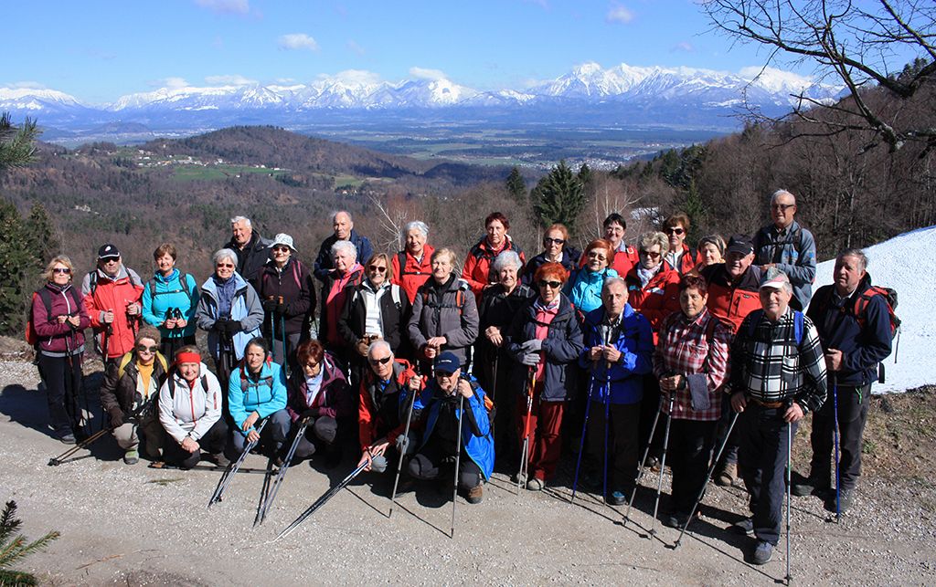 S Topola smo se povzpeli k cerkvi sv. Katarine, od koder ni bilo daleč do vznožja Jeterbenka, 774 metrov visokega gozdnatega vrha. Tu nas je najbolj očaral pogled na zasnežene Karavanke in Kamniško –Savinjske Alpe, kajti čisto ozračje je poskrbelo za širne razglede. Tisti Zimzeleni, ki so se povzpeli še na vrh Jeterbenka, so bili deležni razgleda proti vzhodu, na bližnjo Grmado in Šmarno goro in naselja pod njima.