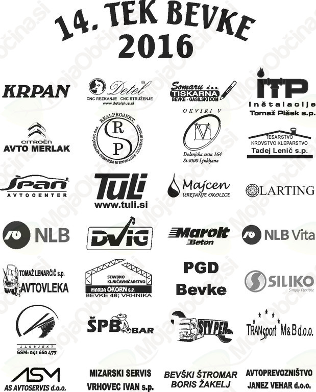 Slovenija v gibanju 365-Športna unija Slovenije, Športno društvo Bevke, Prigo d.o.o., Divinol, Germanol-Adria d.o.o. Ljubljana, Obnova d.o.o., SGV Servis gospodarskih vozil Vehar, Motrio Avtoservis AS-RS d.o.o. Vrhnika, Šampinjoni Smuk d.o.o. Bevke, Foteljček Zdravko Keršmanc s.p., OK Fit Center, Formatisk, M Keršmanc d.o.o., Krajevna skupnost Bevke, Skubic, Matej Skubic s.p., Jorc Pobuda d.o.o., Merkur zavarovalnica, Krpan, Detel Plus d.o.o. Podlipec Boštjan, Tiskarna Somaru, ITP Inštalacije Tomaž Pišek s.p., Citroen servis avto Merlak d.o.o., Realprojekt d.o.o., Okviri V, Krovstvo Tadej Lenič s.p., Avtocenter Špan, Tuli d.o.o., Majcen urejanje okolice, Larting d.o.o., Lenarčič Jože, NLB d.d., Dvig,. Marolt Beton, NLB Vita d.d., Avtovleka Tomaž Lenarčič s.p., Ključavničarstvo Marija Okorn s.p., PGD Bevke, Siliko, J.L. objekt d.o.o. Jernej Lenarčič, ŠPB bar Bevke, Jure Brus s.p., STV Marjan Per s.p., Transport M&B d.o.o., ASM d.o.o. Boris Marolt, Mizarski servis Vrhovec Ivan s.p., Bevški štromar Boris Žakelj in Matjaž Vehar, Avtoprevozništvo Janez Vehar, Atet d.o.o., Rabbit'S transport Karmen Zajec s.p., HIPIS d.o.o., Avtoservis Mele Rok s.p., UVZ d.o.o. Žakelj Vinko, Bevarn Marko Perko s.p., A-Sprint d.o.o., Ana Kavčič, Log, A-cosmos d.d., Kmetija odprtih vrat pri Janš Koreno nad Horjulom, L.ask d.o.o. Borovnica, Sensilab, Ženko d.o.o., Opus, Web company, Gostiša Jože iz Zabrda, Marica Švagelj, Vezenje Bovha, Štirn d.o.o. Vrhnika, Juvi d.o.o., Lepotilni kotiček Polona Smuk s.p., Avtostoritve Nartnik, Jernej Nartnik s.p., Marija Jeraj s.p., Kmetija Pr`Lavr Dolinar Bevke, Jožica Rauter s.p., Frizerski salon Sara Drenov Grič, Studio R.M., Renata Metljak, vizažistka, Galija d.o.o., Summit leasing Slovenija d.o.o., Žabji fit studio Bevke, KIMM d.o.o. Logatec, Kemis, Adult M-5 d.o.o., E-mojster d.o.o., Clas Maja Novak Domžale, Dvig d.o.o., Optika Suke, Jan Sport Vrhnika, Mile Nikolić, Ljubljana, MOL Ljubljana, LMM, Mitras, Laborplast d.o.o., Odorfer d.o.o., AS- Adriatic Slovenica, Peter Ogrinc Bevke, Forch Ljubljana, Avtotehna Vis, Jože Gostiša Bevke, Picerija Brajda Šmarje Sap, Juvi domžale, Gostilna Turšič Vrhnika, Foerch d.o.o., Gostilna Pr`Kopač, Kmetija Švigelj Blatna Brezovica, EGO lecta, Kamnolom Mivšek, Piškoti Adamič Vrhnika, Pekarna Zalog, Milena Narandža, Domžale, Kocka Vrhnika, Super Pšanc Brezovica, Francka Seliškar, Dragomer, Milica Brejc, Log, Amoret d.o.o. restavratorstvo, Harvey Norman, Gostilna Kavčič, Marjan Lenarčič, A-Gea Kristjan Ferjančič, Gostiša d.o.o., Roman Gostiša, Hrusty Igor Dolinar s.p., Barcaffe, Družina Golomboš Bevke, Družina Ajlec-Petkovšek, Cvetka Kozole, Čaplja d.o.o., Truck servis Gostiša Marko s.p., Kamnoseštvo Dolničar Marko s.p., Slaščičarna Berzo Vrhnika, Telekom, Decathlon, Cvetličarna Karmen, Bevške maškare, Marolt beton, Generali d.d., Rotar Podsmreka, R-Group d.o.o., Hrušica, Regeneracija – barve in maziva, Silvo Dolinšek s.p., Ig, Avtrotrade d.o.o. Vrhnika, Zavarovalnica Triglav, Grega Gaber in Tanja Gaberščik, Krajani Bevk in mnogi neimenovani posamezniki.