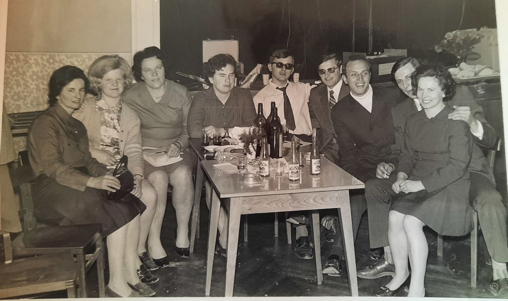 Fotografija predstavlja prodajalce na neki zabavi. Na desni strani so prodajalci iz Tehnične trgovine, na levi iz Delikatese.