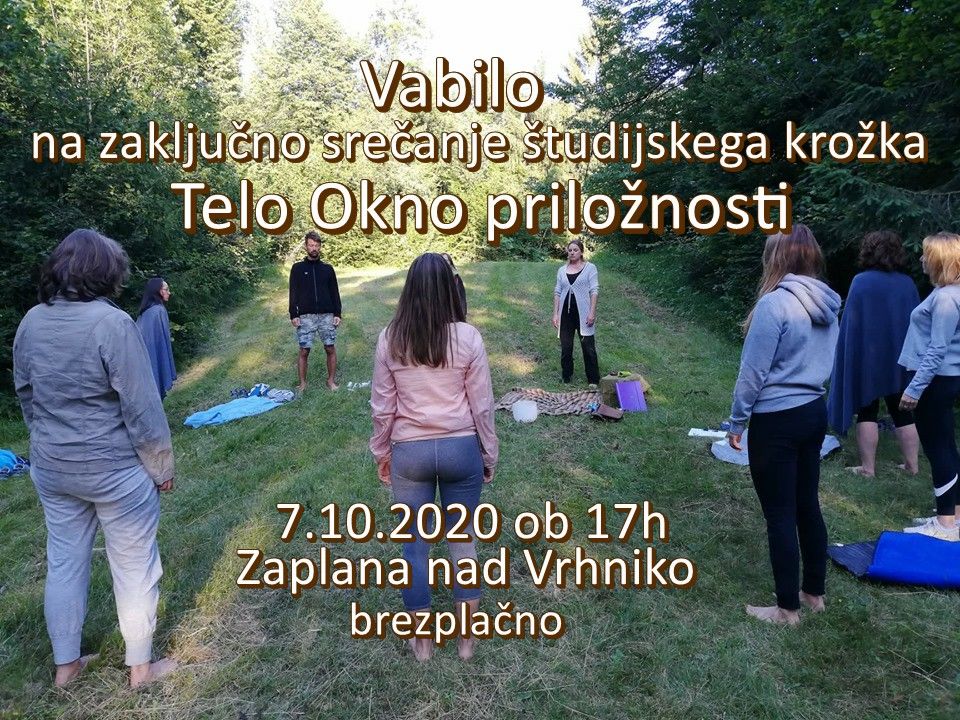 To sredo 7.10.2020 ob 17h na Zaplani nad Vrhniko na predstavitev brezplačnega študijskega krožka Telo – okno priložnosti, ki ga organizira Gozdna šola Hosta s podporo Andragoškega centra Slovenije in Ministrstva za izobraževanje, znanost in šport.