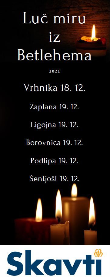 Vrhniški skavti obveščajo, da bodo ta vikend prinesli Luč miru iz Betlehema. Na Vrhniki jo bodo delili v soboto, na Zaplani, v Ligojni, Borovnici, Podlipi in v Šentjoštu pa v nedeljo 19. 12. Vabljeni.